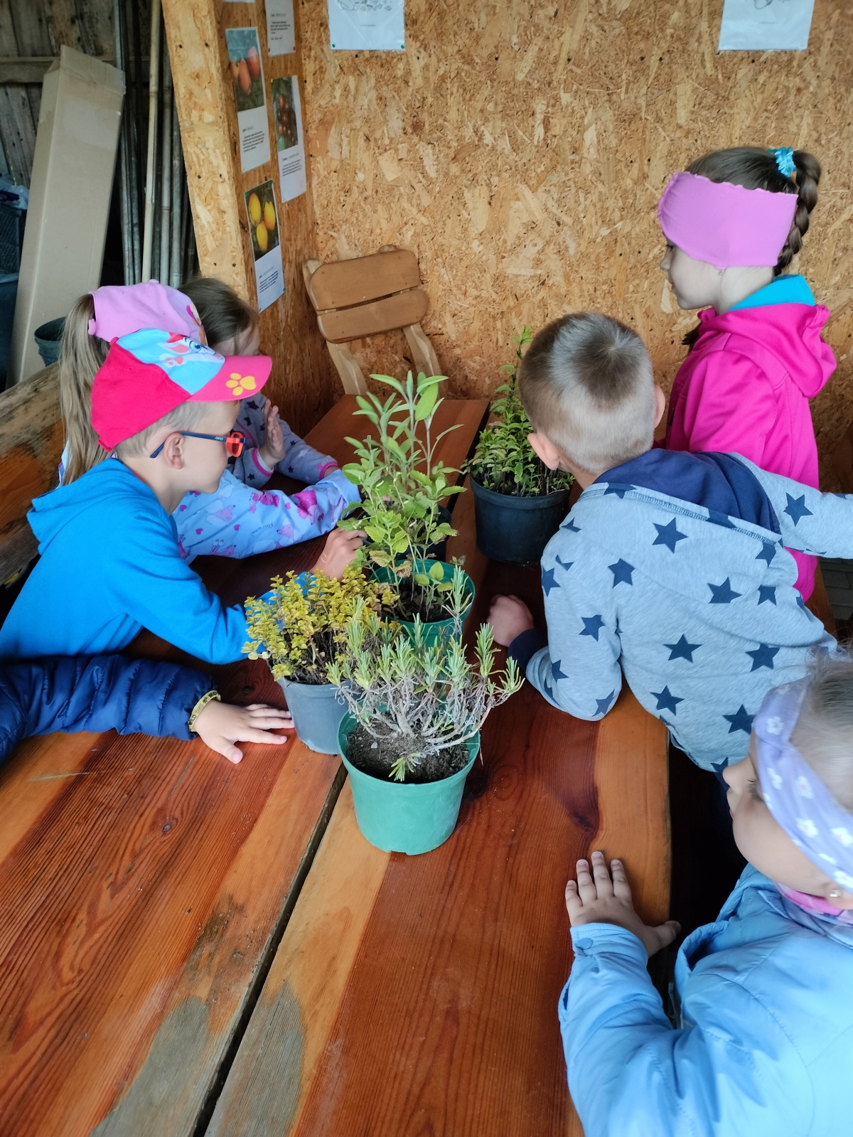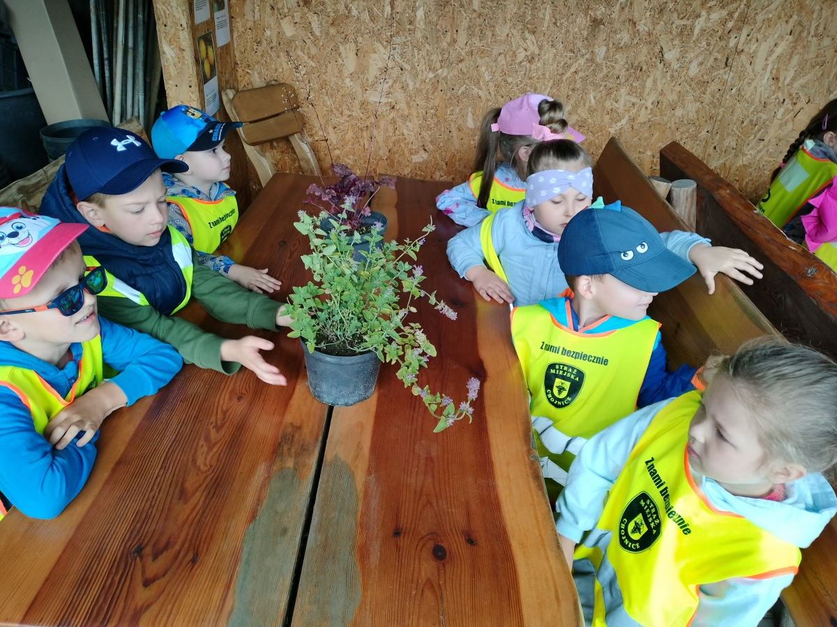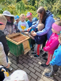 Dzieci były zachwycone i z niezwykłą uwagą słuchały naszych Pań , które z pasją opowiadały o roślinach znajdujących się w szkółce. Wspólnie obejrzeliśmy: drzewka, krzewy, zioła. Największym zainteresowaniem cieszyły się krzewy i drzewka owocowe. Dzieci zobaczyły jak rosną jabłka, gruszki, maliny, borówki i żurawina zanim trafią do sklepowych koszy i skrzynek. Wiedzą jak można ratować owady w upalne dni.