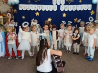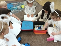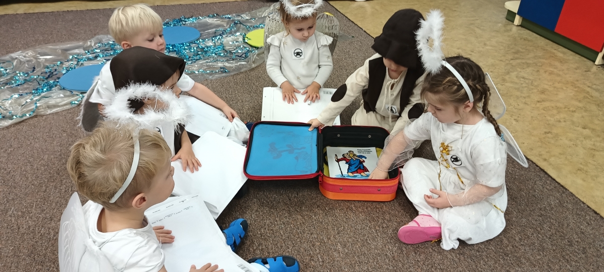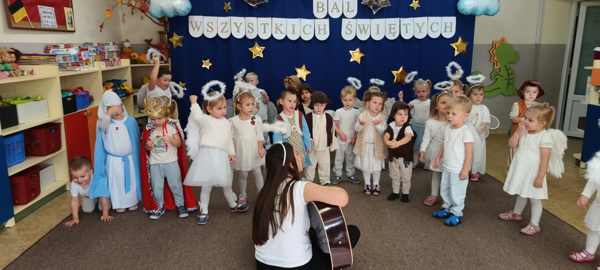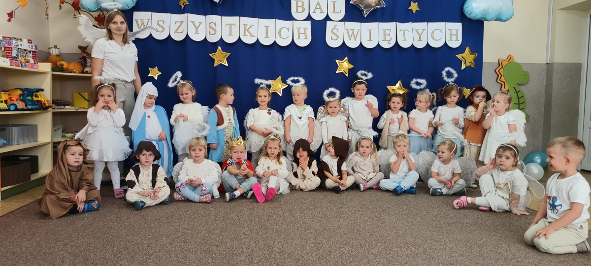 W naszym przedszkolu odbył się radosny Bal Wszystkich Świętych. Dzieci przyszły przebrane za swoich ulubionych świętych i aniołki, brały udział w różnych zabawach. Z św. Krzysztofem maluszki przechodziły przez „rzekę”, ze św. Piotrem łowiły „klucz do nieba”, ze św. Florianem gasiły „pożar”, a ze św. Janem Pawłem II trafiały piłką do celu. Było dużo śmiechu, ruchu i radości. Dzieci dowiedziały się, że święci to ludzie dobrzy, pomocni i uśmiechnięci – tacy, jakimi każdy z nas może być na co dzień.
