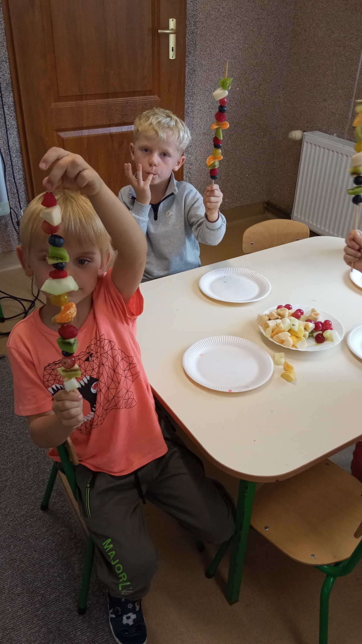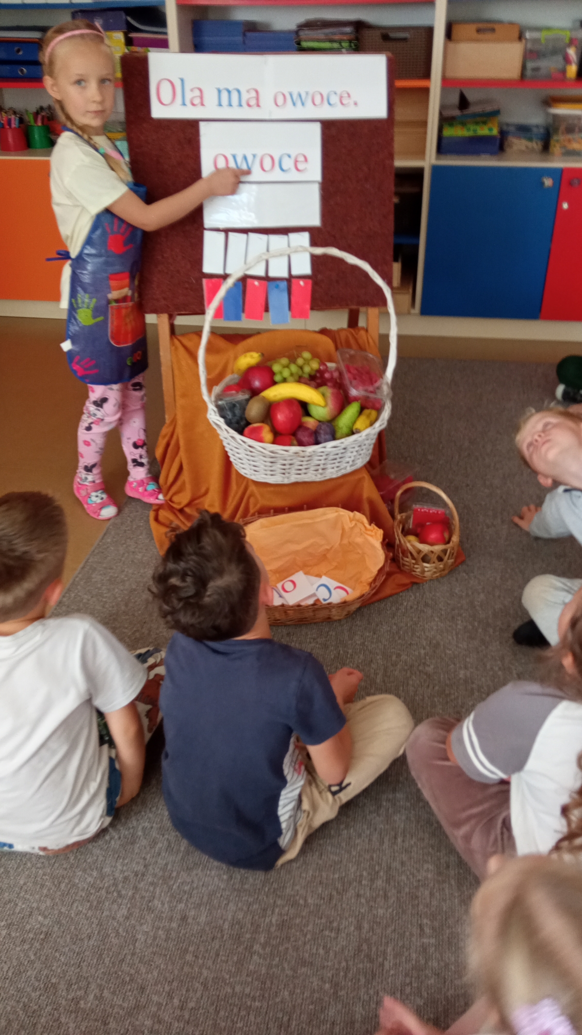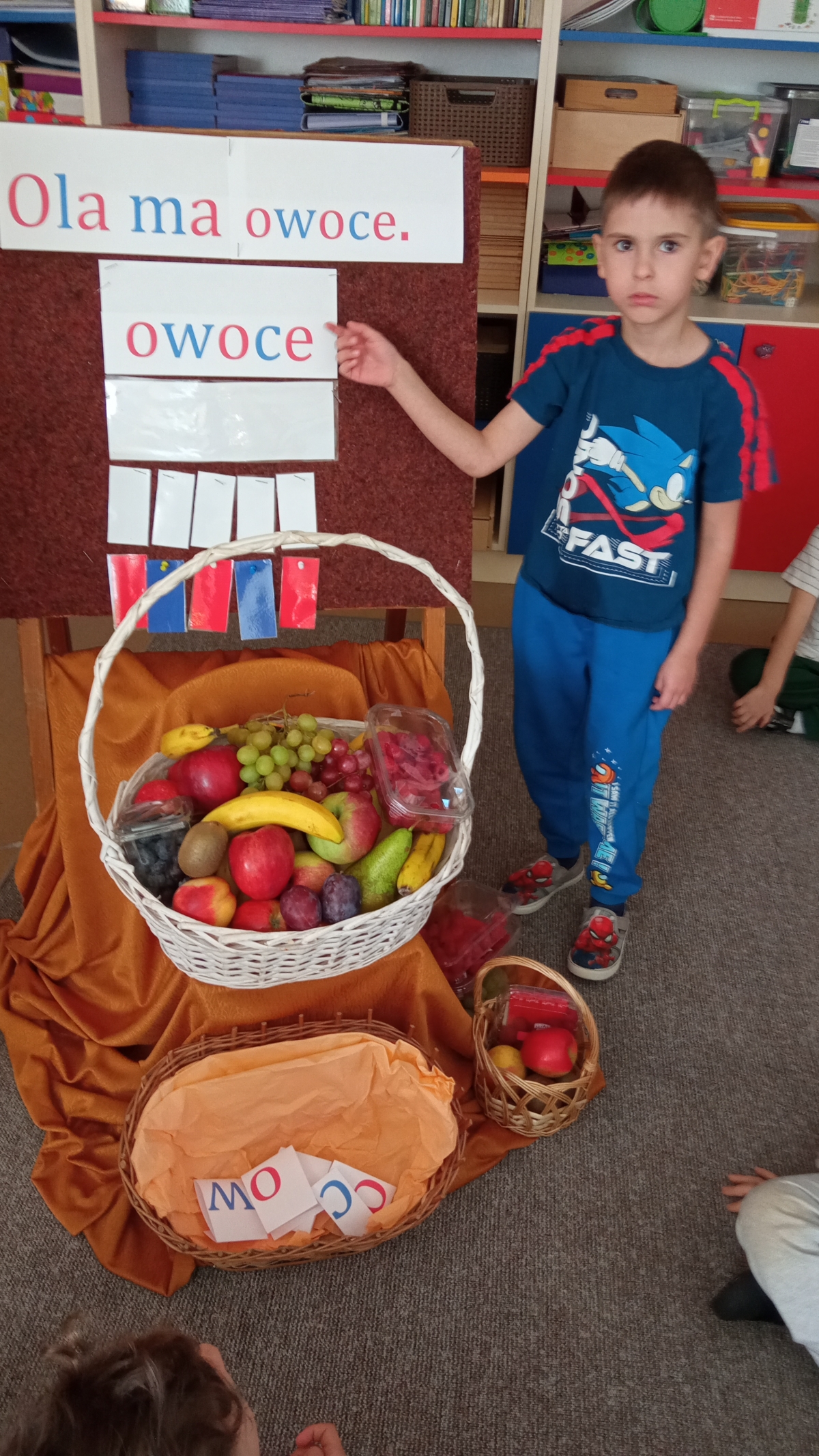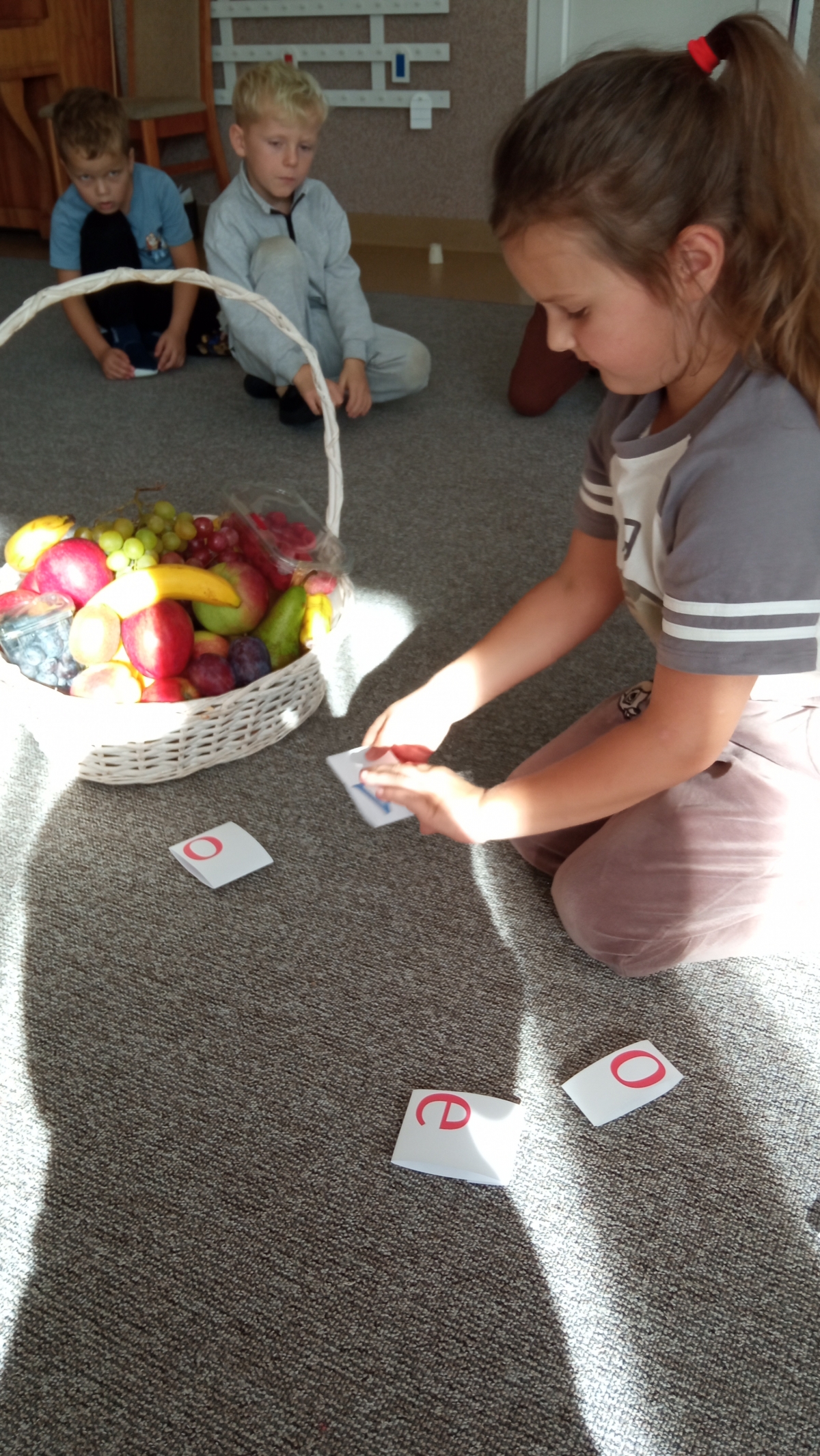 Wyróżniały głoski w nagłosie, śródgłosie i wygłosie, słuchały w skupieniu opowiadania i wyszukiwały poznaną literę o ,szukały na obrazku wyrazów z głoską o oraz w swoim otoczeniu.Dzieci potrafią już głoskować wyrazy oraz układają model wyrazu ,,owoce.’’ Z wszystkich owoców, które znalazły się w koszu Oli sześciolatki zrobiły zdrowe i smaczne , owocowe szaszłyki.
