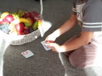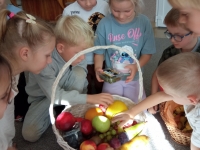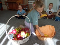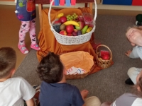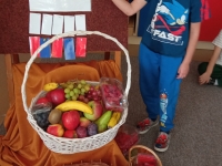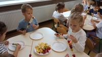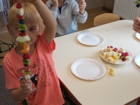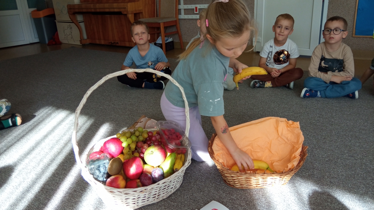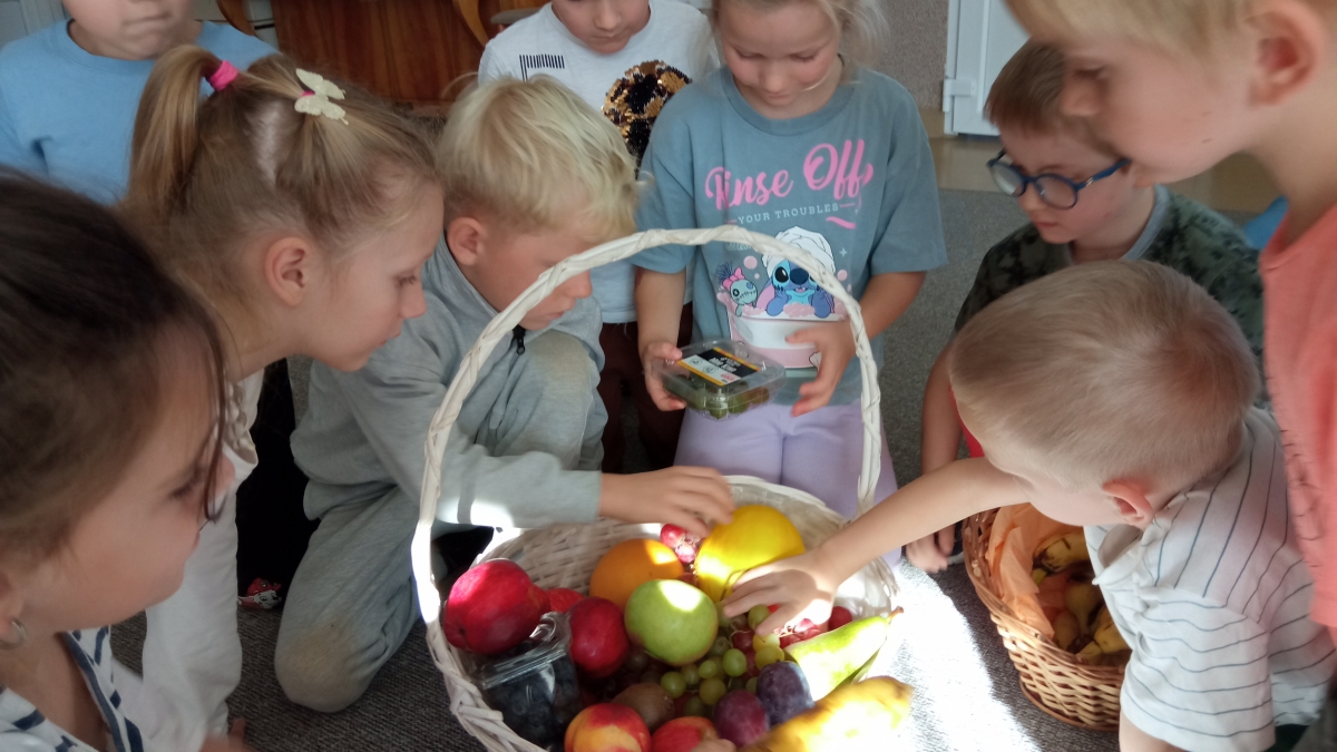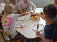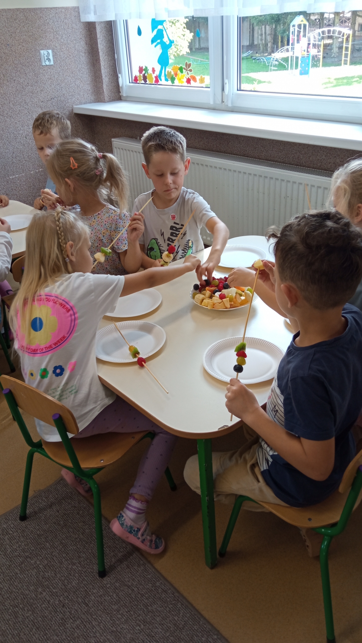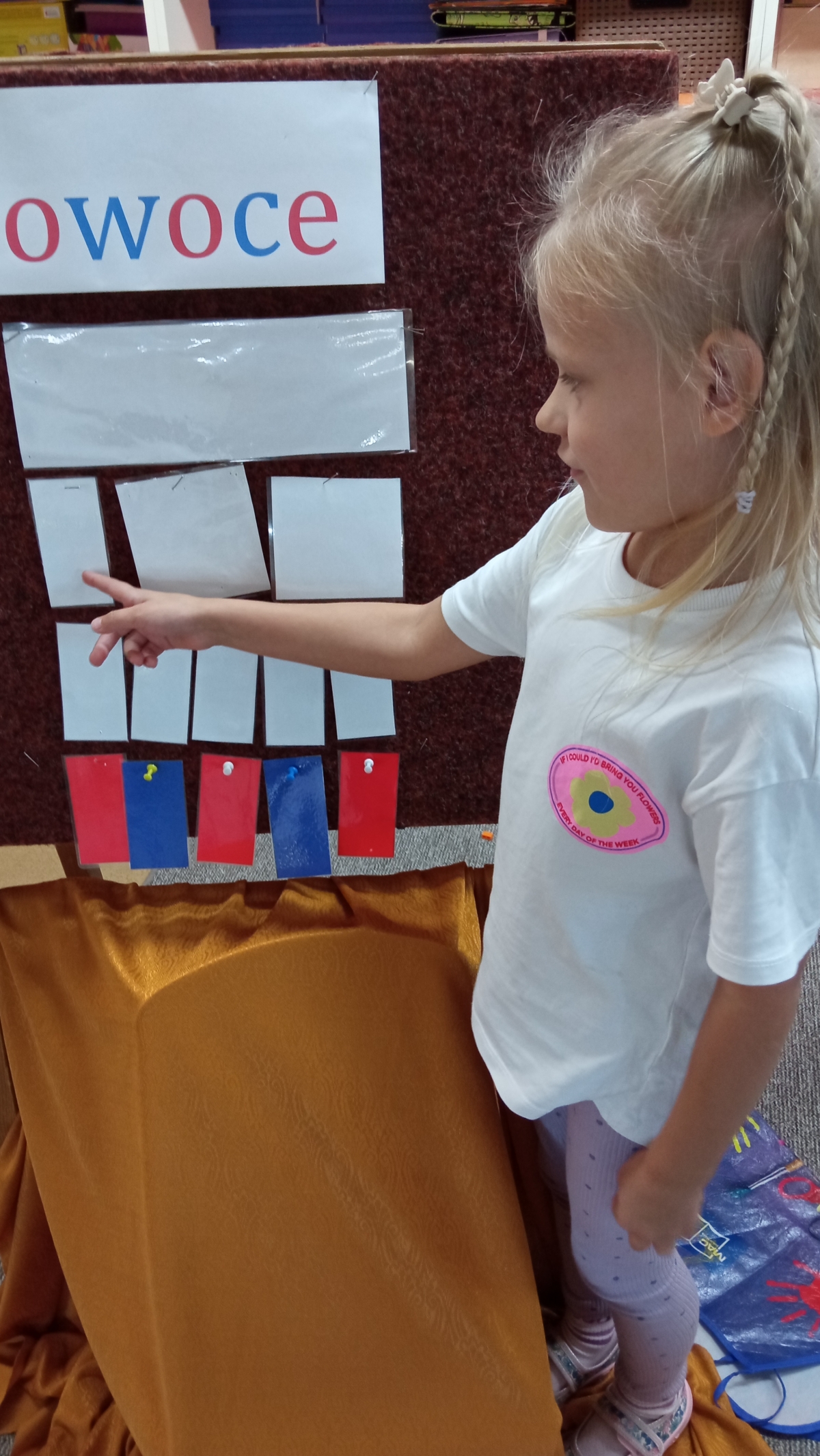 Wyróżniały głoski w nagłosie, śródgłosie i wygłosie, słuchały w skupieniu opowiadania i wyszukiwały poznaną literę o ,szukały na obrazku wyrazów z głoską o oraz w swoim otoczeniu.Dzieci potrafią już głoskować wyrazy oraz układają model wyrazu ,,owoce.’’ Z wszystkich owoców, które znalazły się w koszu Oli sześciolatki zrobiły zdrowe i smaczne , owocowe szaszłyki.