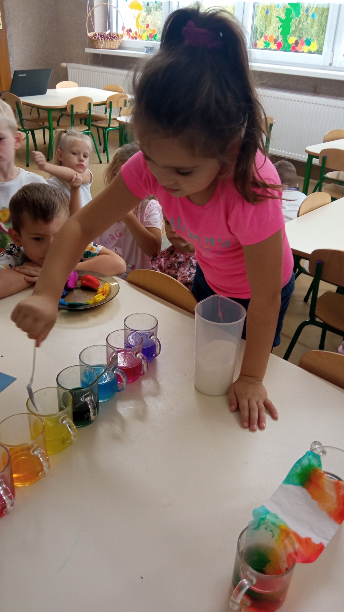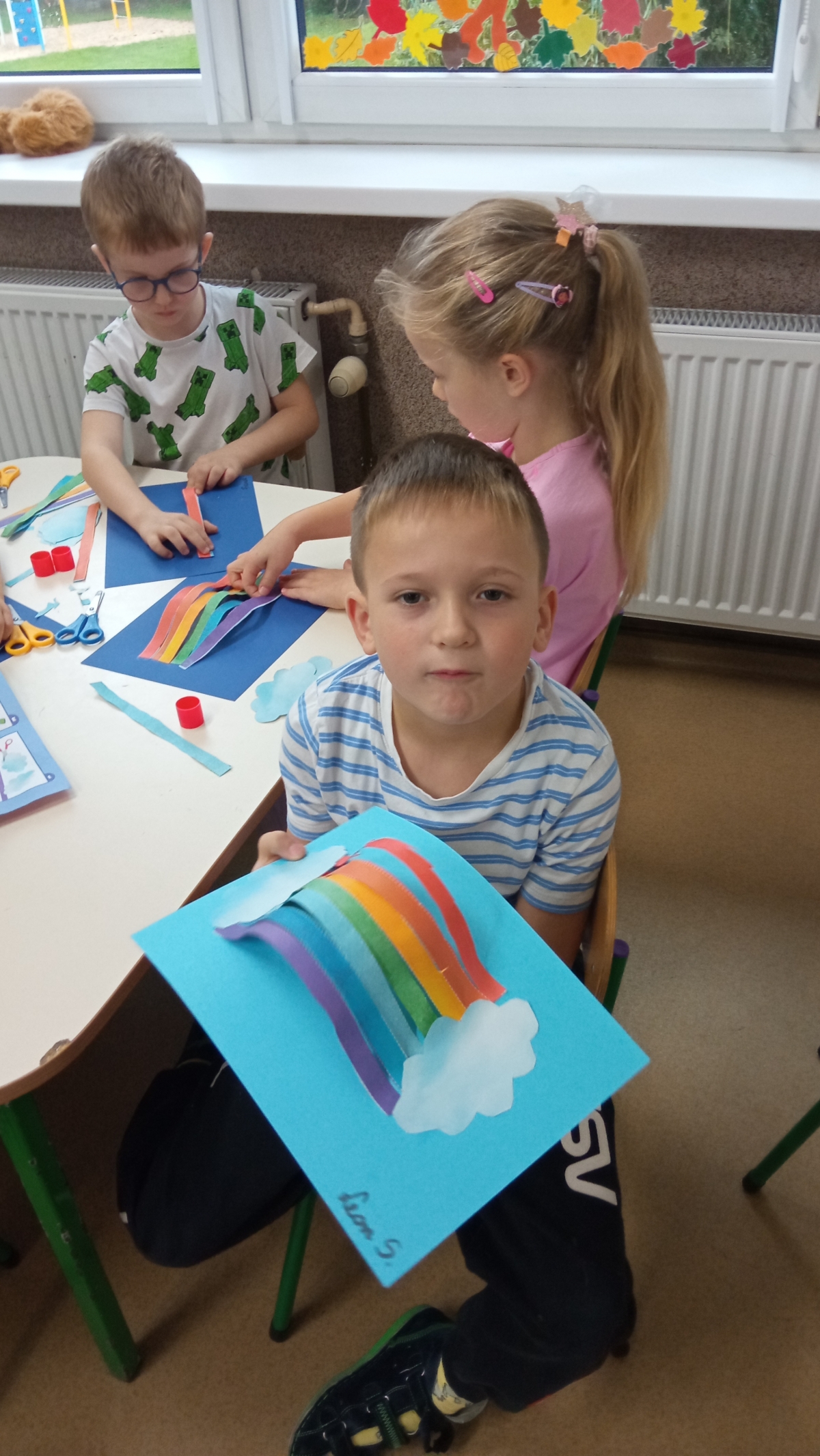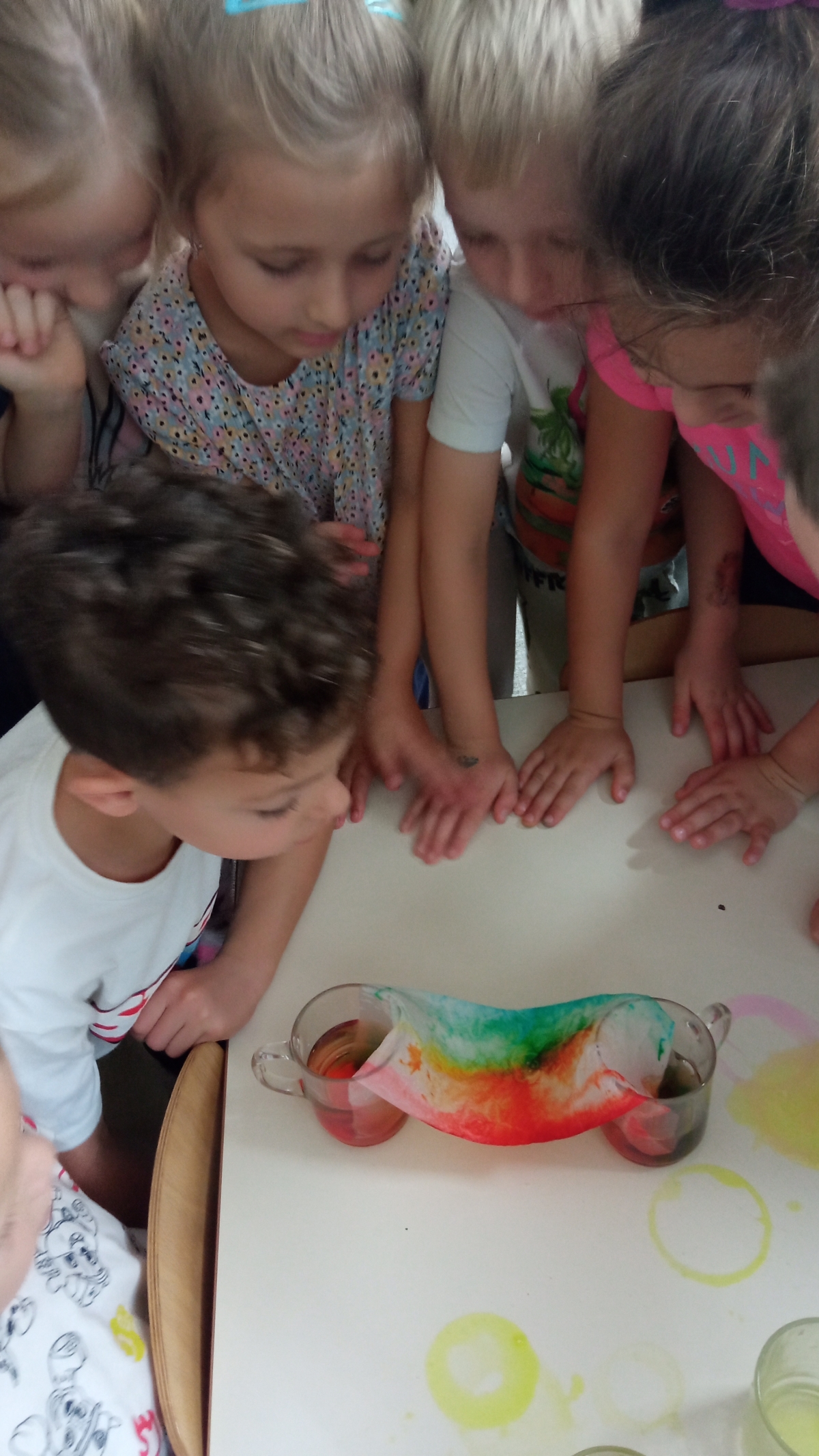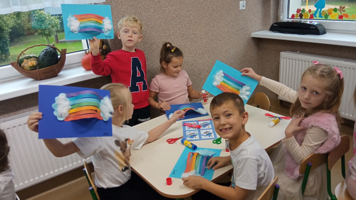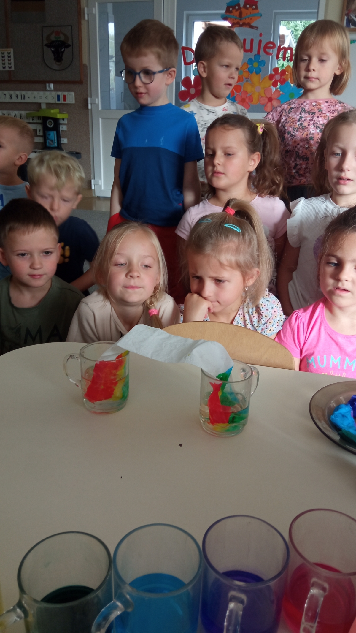 Podczas zajęć przyrodniczych, dzieci przeprowadzały fascynujące eksperymenty. Tęcza –za pomocą kolorowej bibuły i wody, dzieci stworzyły tęczę w pojemnikach. Obserwowały, jak kolory bibuły rozpuszczają się w wodzie, tworząc efekt tęczy. Eksperyment wprowadził dzieci w świat zjawisk optycznych i kolorów. Eksperymenty rozwijały ciekawość przyrodniczą dzieci i wprowadziły je w świat nauki poprzez zabawę. Podczas zajęć plastyczno- technicznych samodzielnie stworzyły piękne tęcze.
