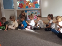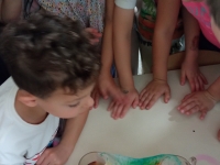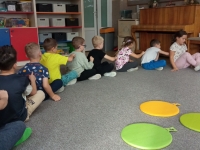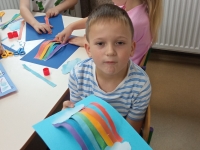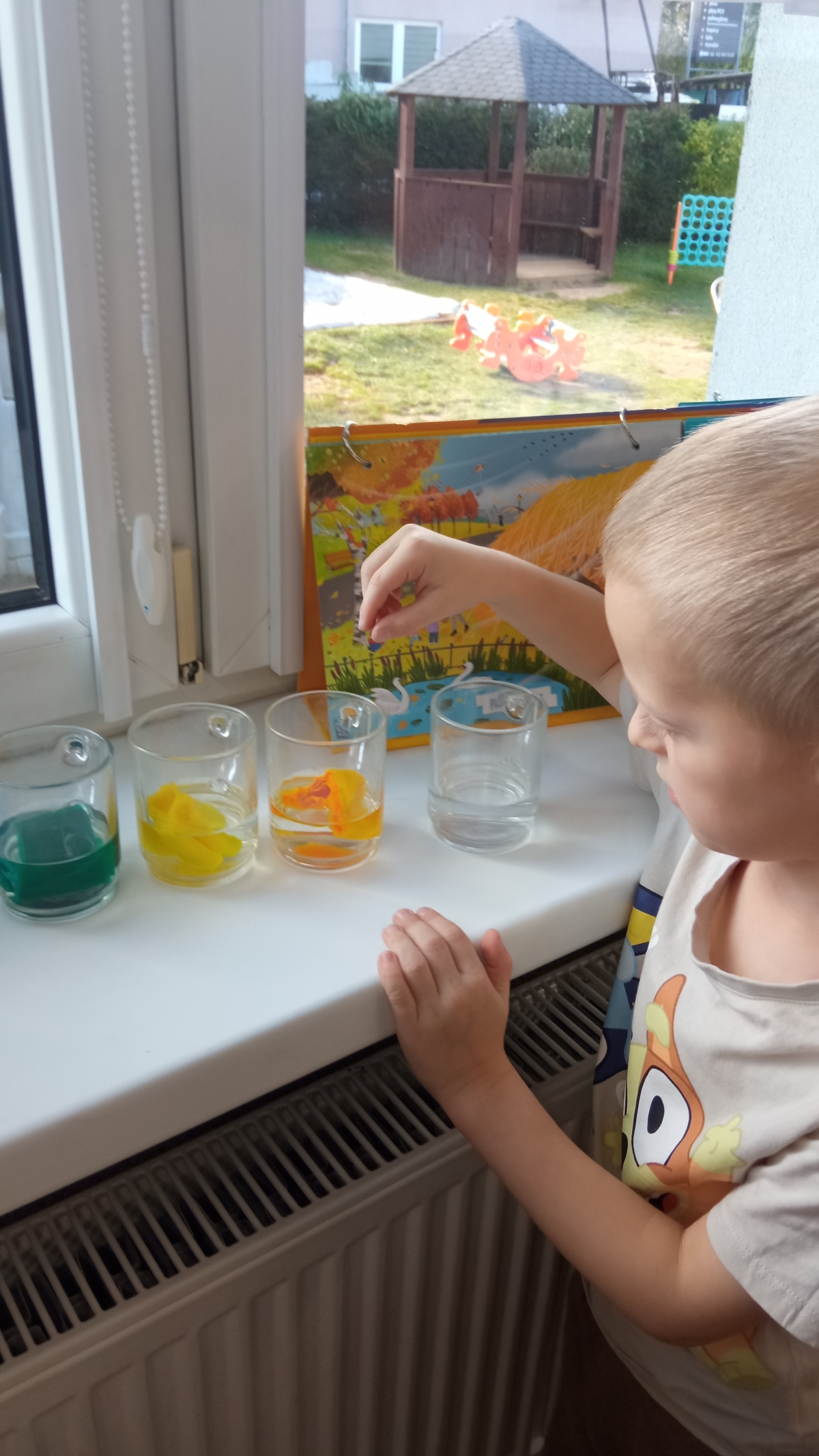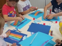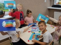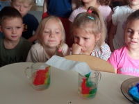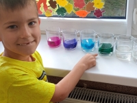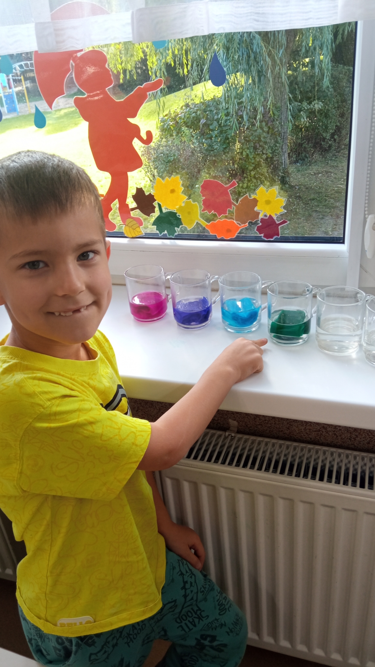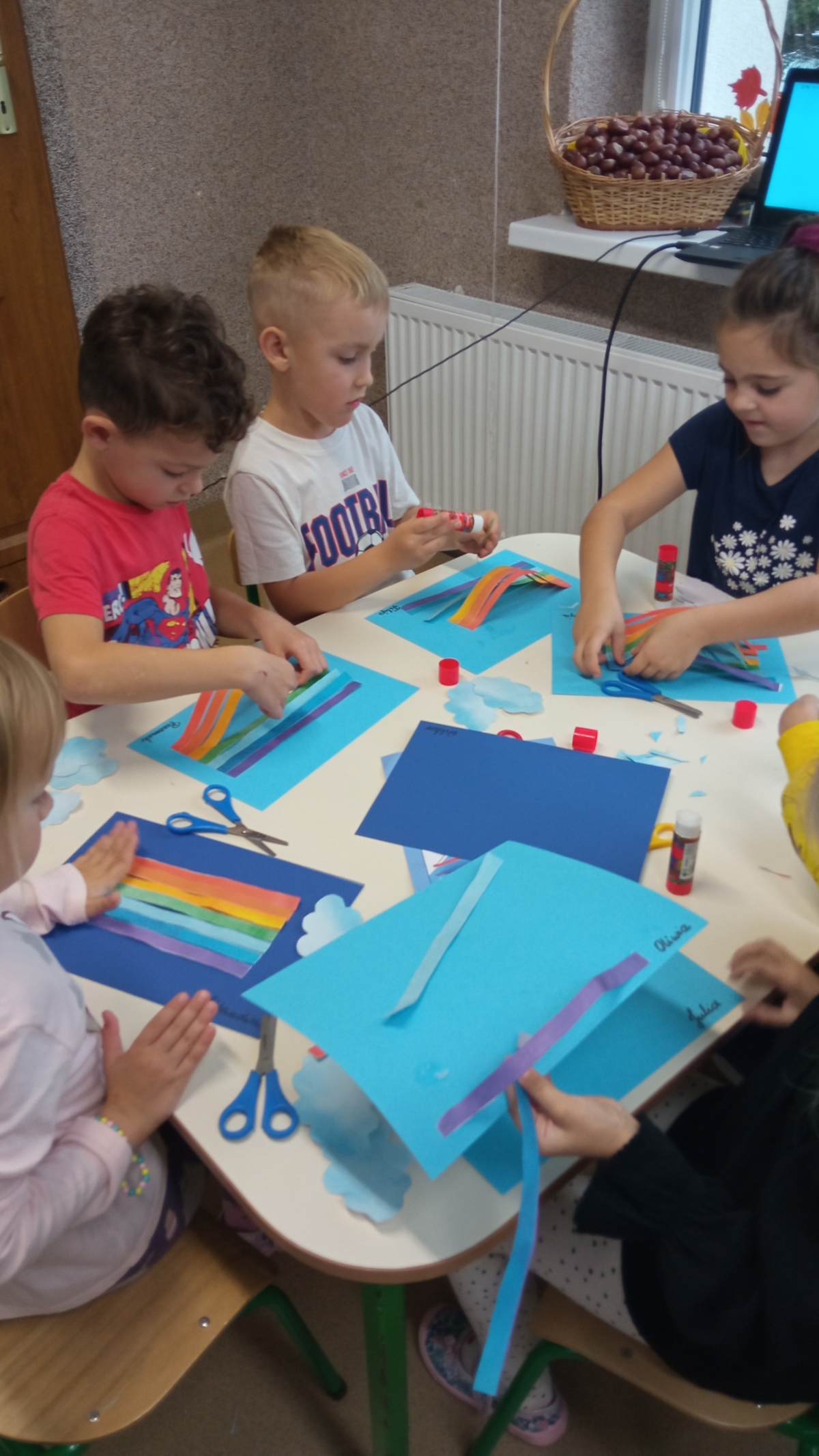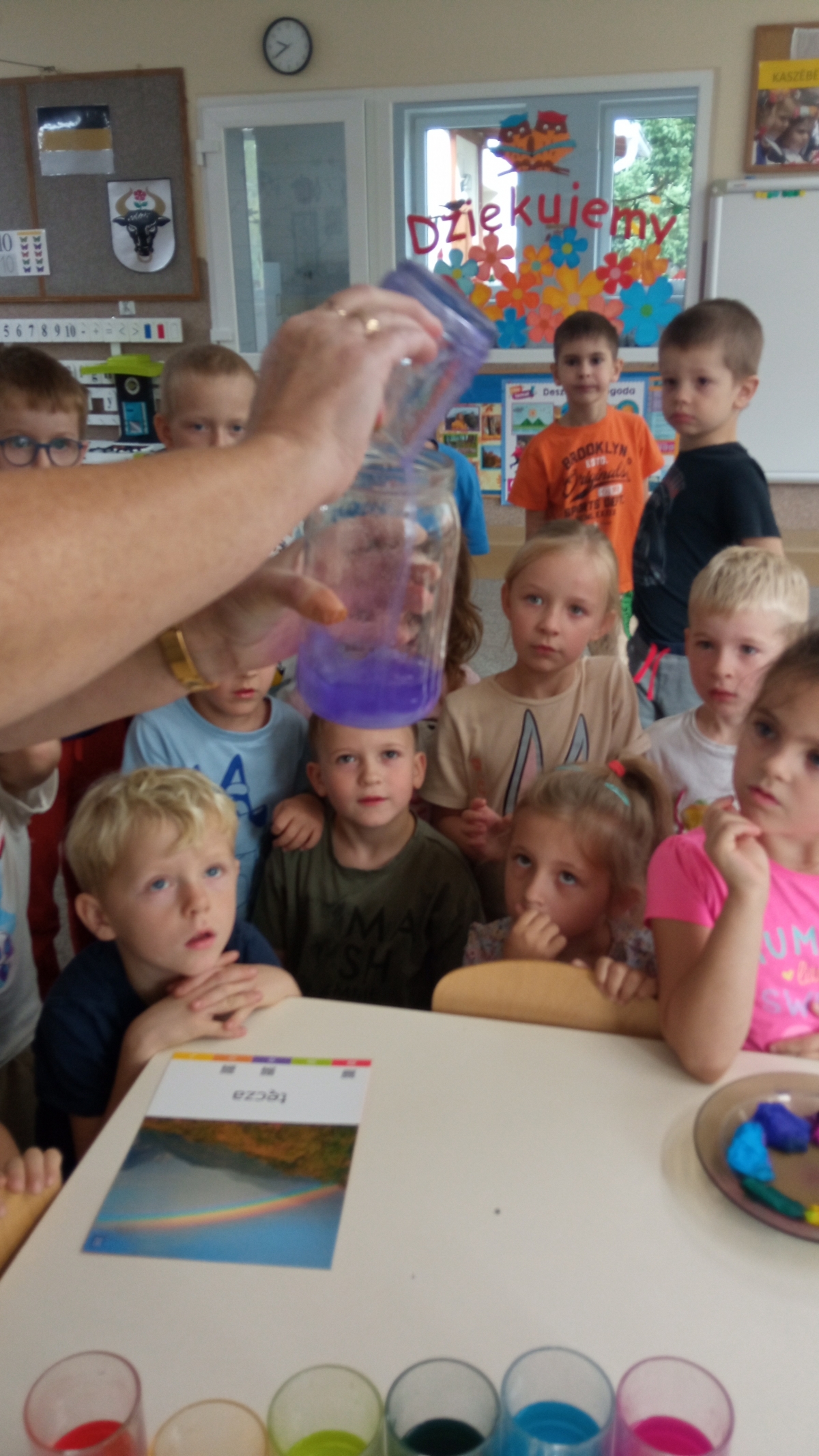 Podczas zajęć przyrodniczych, dzieci przeprowadzały fascynujące eksperymenty. Tęcza –za pomocą kolorowej bibuły i wody, dzieci stworzyły tęczę w pojemnikach. Obserwowały, jak kolory bibuły rozpuszczają się w wodzie, tworząc efekt tęczy. Eksperyment wprowadził dzieci w świat zjawisk optycznych i kolorów. Eksperymenty rozwijały ciekawość przyrodniczą dzieci i wprowadziły je w świat nauki poprzez zabawę. Podczas zajęć plastyczno- technicznych samodzielnie stworzyły piękne tęcze.