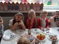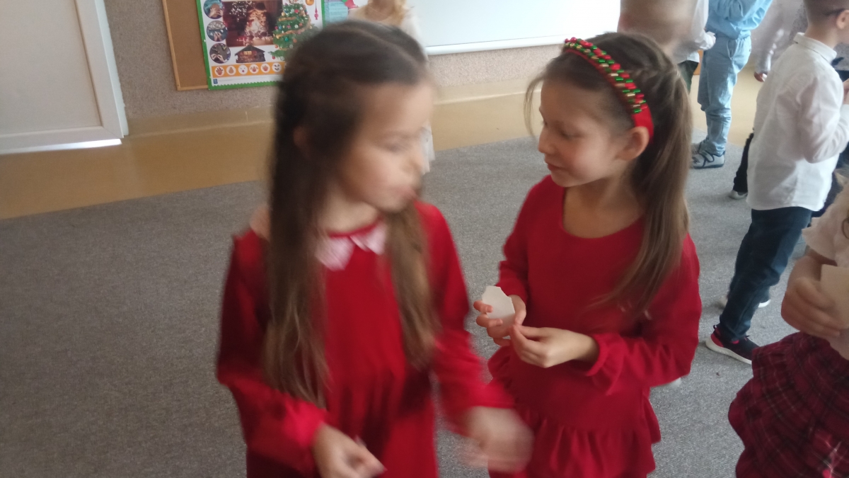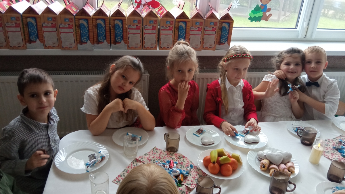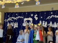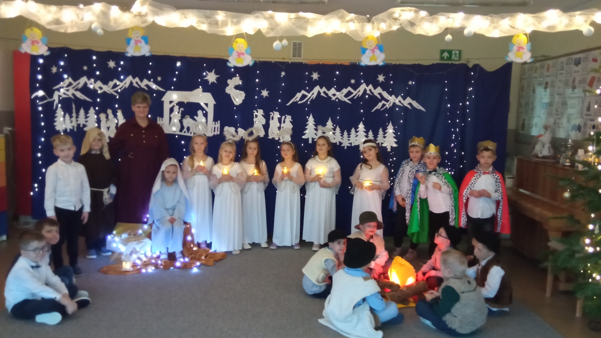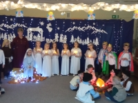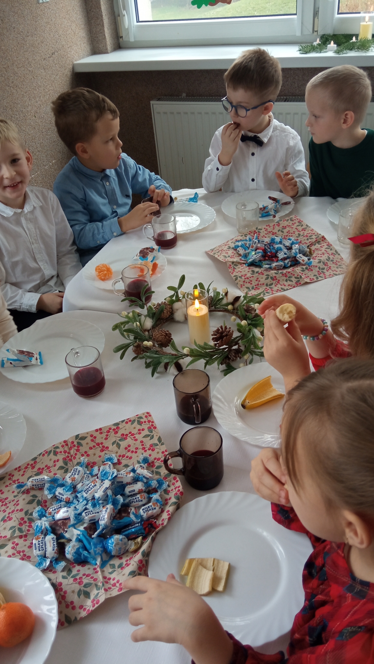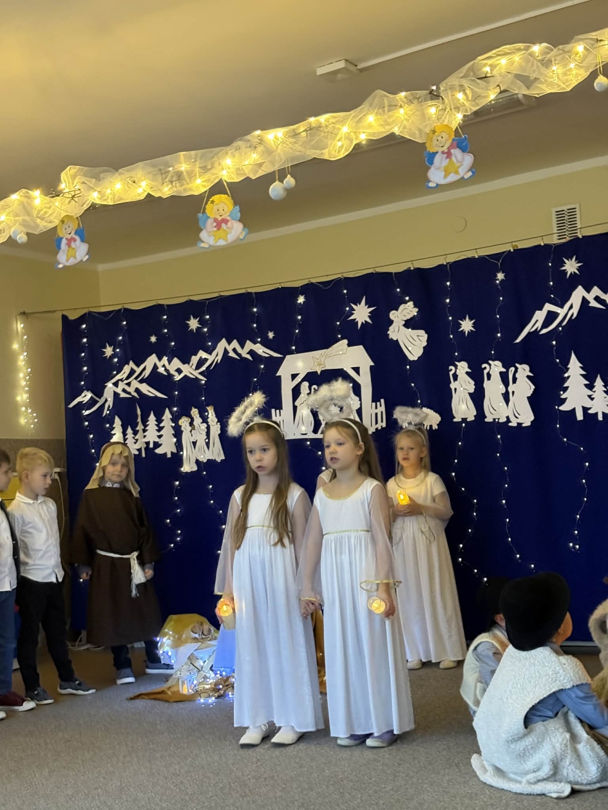 18 grudnia odbyła się Uroczystość wigilijna w naszym przedszkolu.Wszystkie przedszkolaki obejrzały Jasełka, zaprezentowane przez dzieci z naszej grupy, a następnie spotkały się przy wigilijnym stole. Przedszkolaki składały sobie świąteczne życzenia , dzieliły się opłatkiem i kosztowały wigilijnych potraw, przygotowanych przez Panie Kucharki oraz śpiewały kolędy
