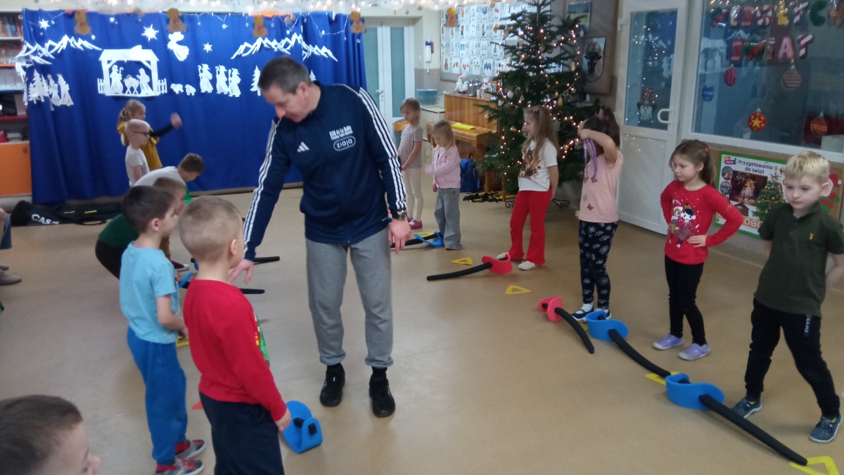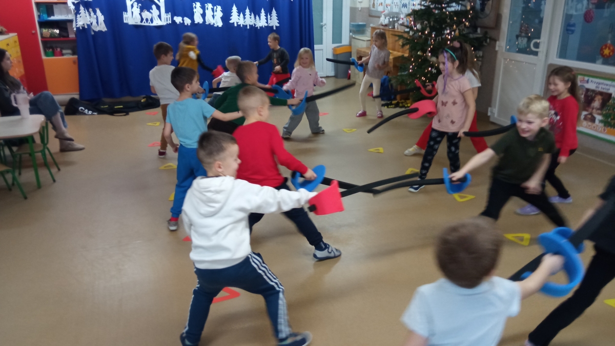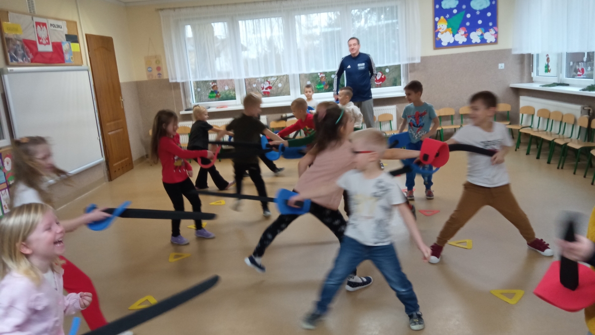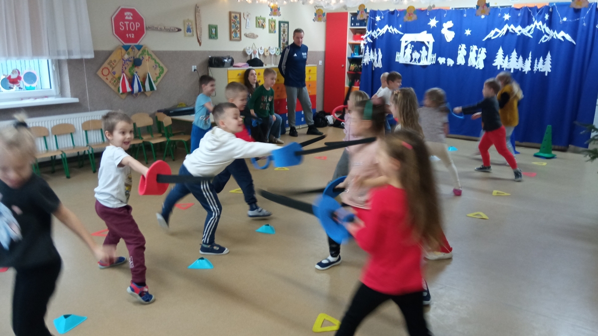 Dnia 22 grudnia odwiedził nasze przedszkole po raz kolejny wyjątkowy gość - instruktor i trener szermierki pan Piotr Kuzas, który przedstawił dzieciom świat sportowej elegancji oraz precyzji. Zuchy z ogromnym zainteresowaniem wzięły aktywny udział we wszystkich zabawach sportowych, ambitnie realizowały sportowe zadania, które zaproponował trener szermierki.