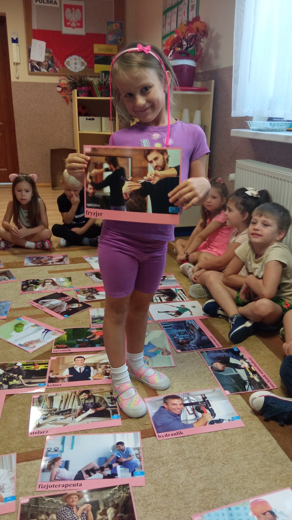 Dużo czasu poświęciliśmy na rozwój mowy i ćwiczenia słuchu fonematycznego. Dzieci wysłuchiwały głoski, jakie znajdowały się w nagłosie imion. Dzięki wyobraźni przedszkolaki mówiły o swoich marzeniach i wymarzonych zawodach.