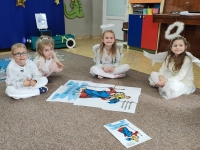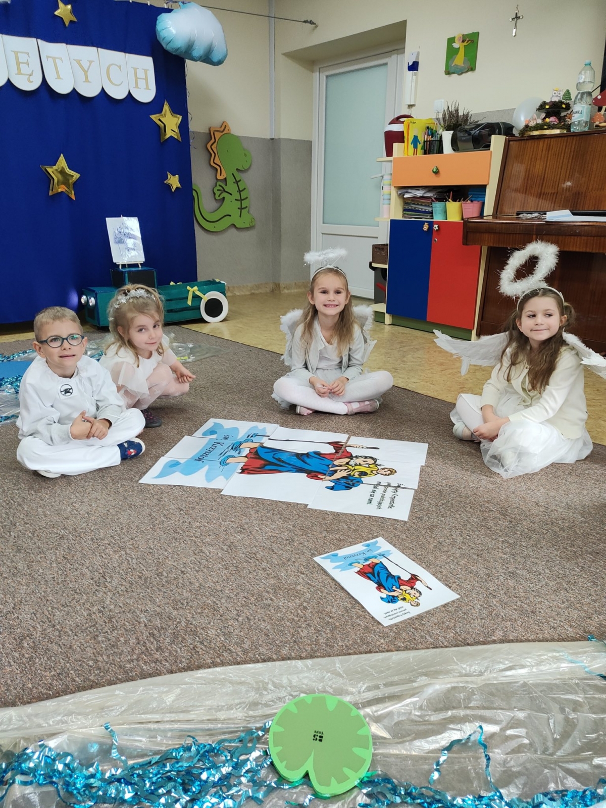 Podczas Balu Wszystkich Świętych starszaki miały swojego patrona – św. Floriana. Przygotowały różne aktywności i zadania, które czekały na inne dzieci. Przedszkolaki odwiedzały kolejne sale, gdzie wykonywały wyzwania związane z różnymi świętymi. Całe wydarzenie przebiegło w radosnej atmosferze i pełne było twórczej zabawy.