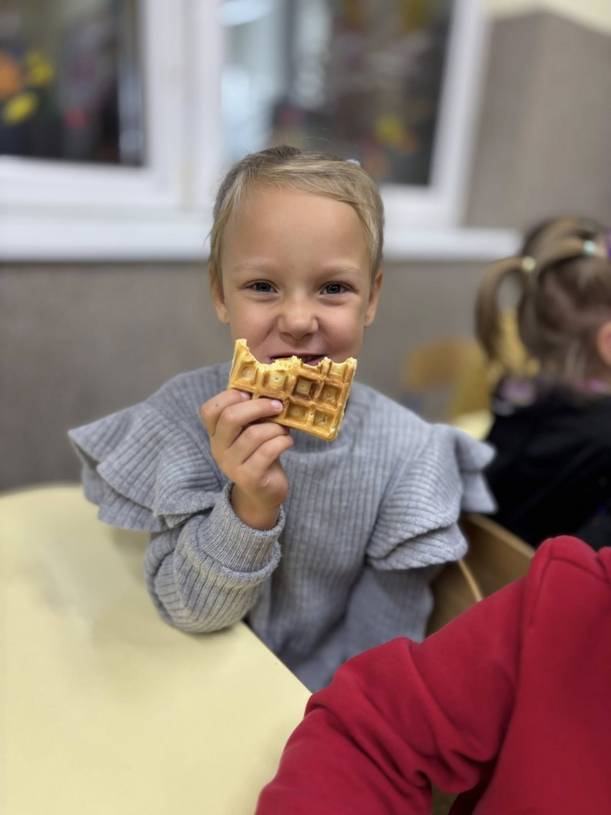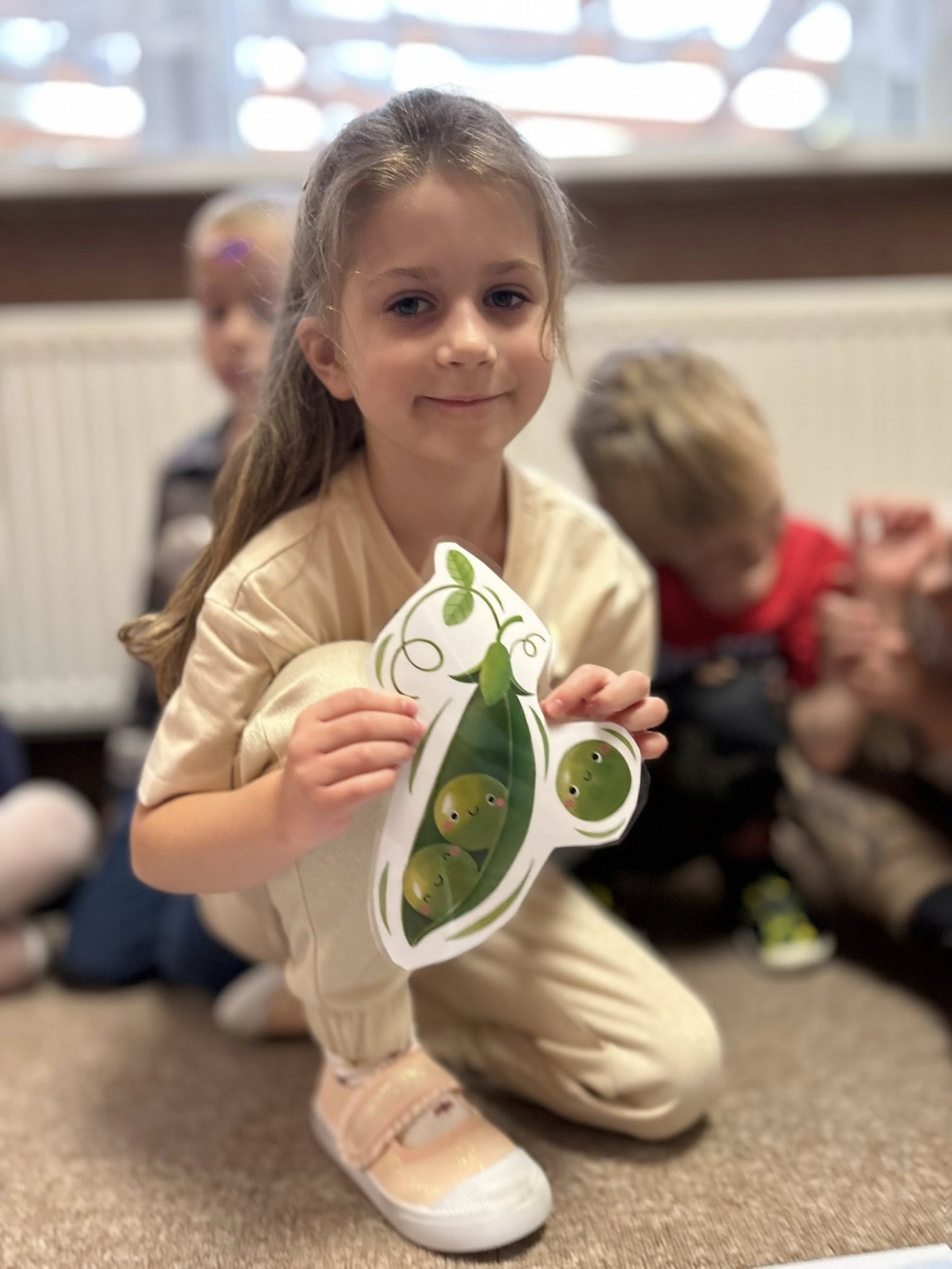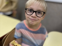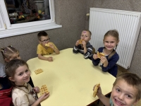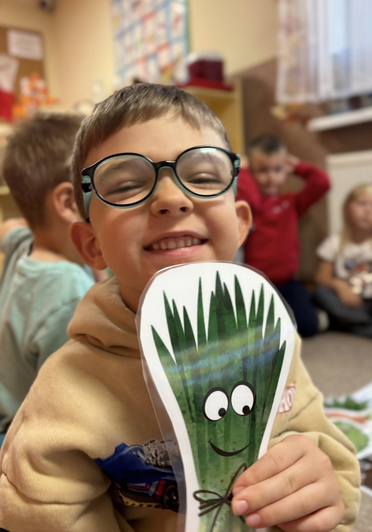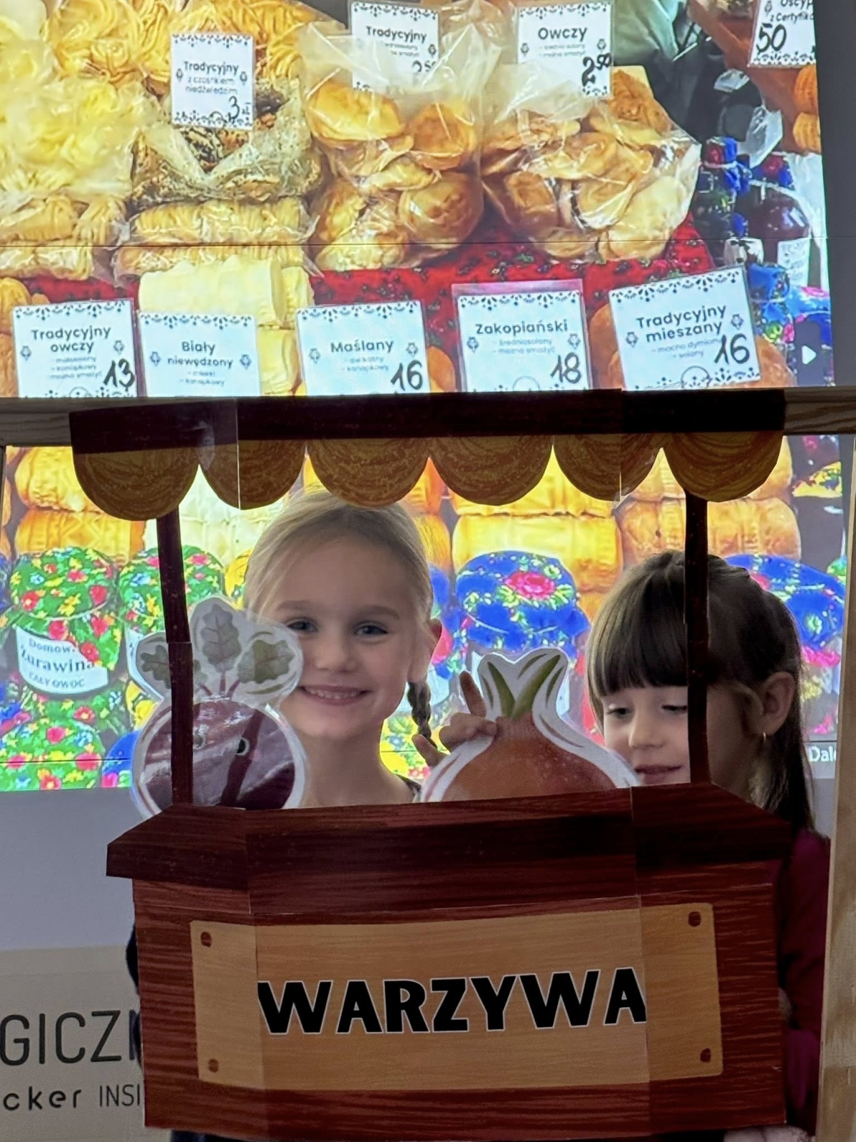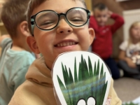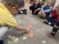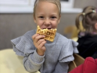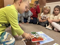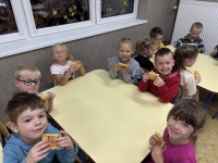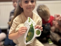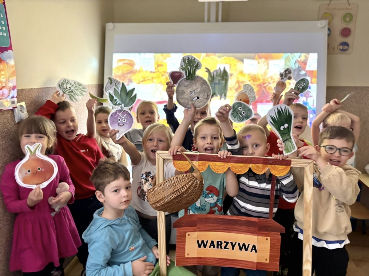 Starszaki z radością wcieliły się w role, prezentując improwizowane przedstawienie ,,Na straganie". Przy tej okazji utrwaliły wiedzę o tym, które warzywa rosną w ziemi, które nad ziemią, a które na pnączach. Nie zabrakło też kulinarnych wrażeń – dzieci z apetytem zjadły gofry z tartą marchewką, a na zakończenie wykonały pracę plastyczną przedstawiającą pomidora. To był dzień pełen śmiechu, nauki i smakowitych doświadczeń!