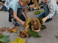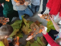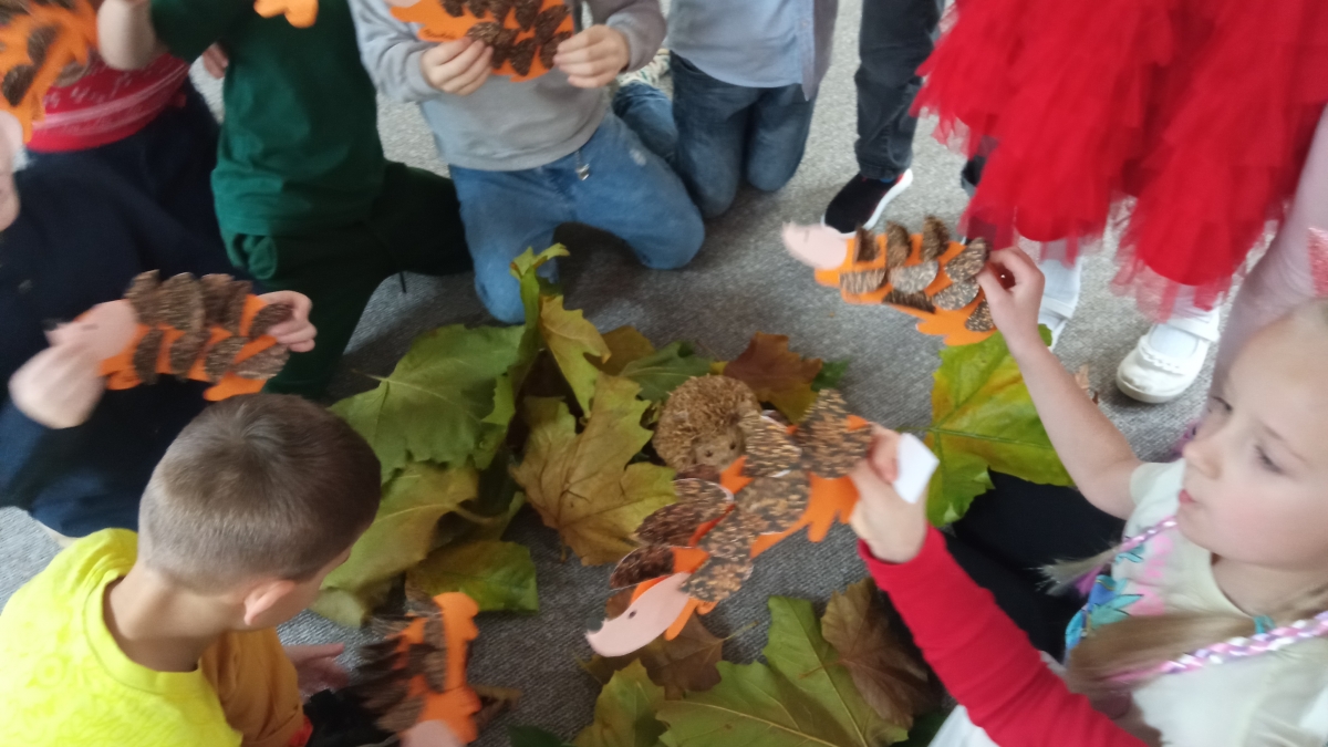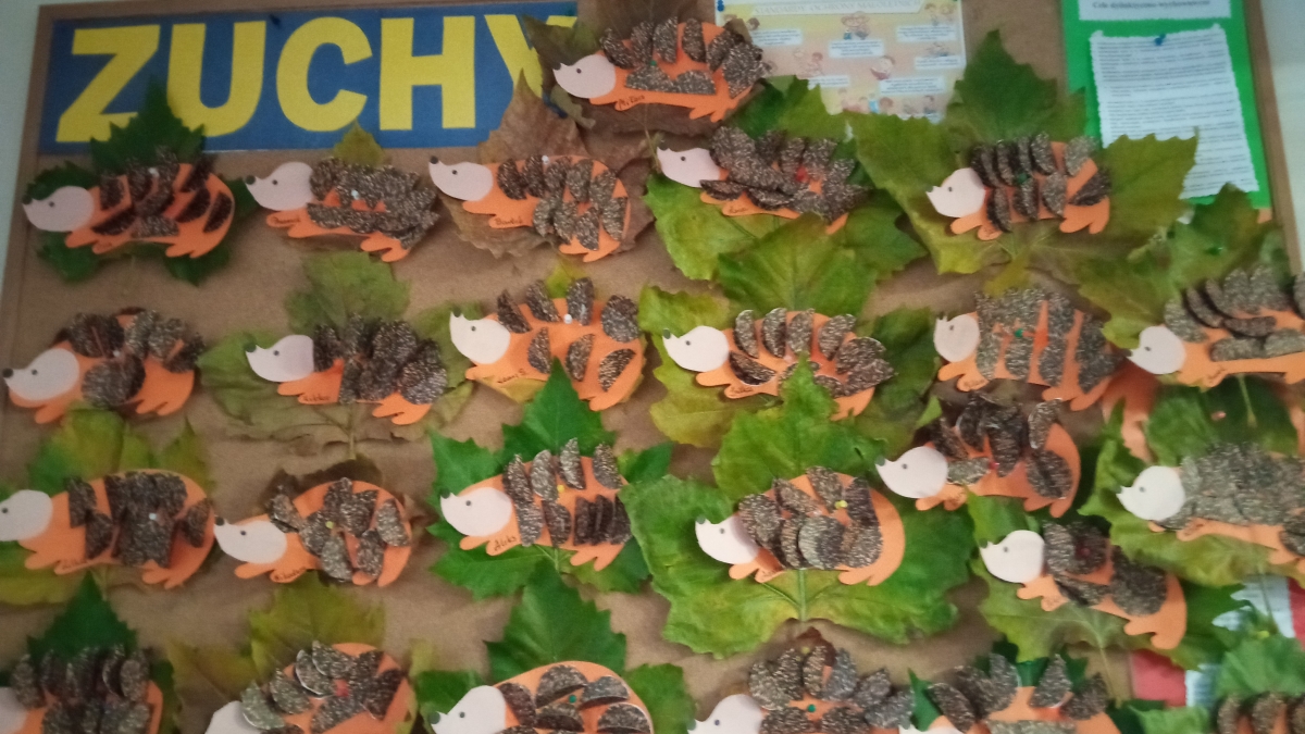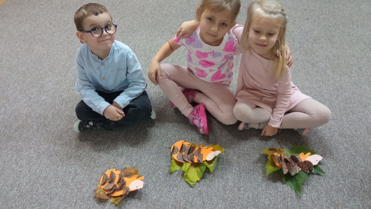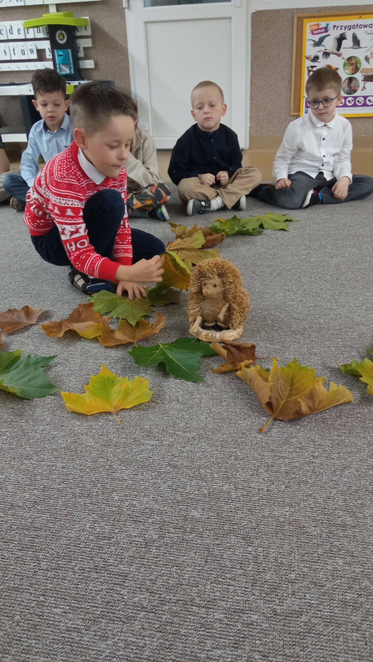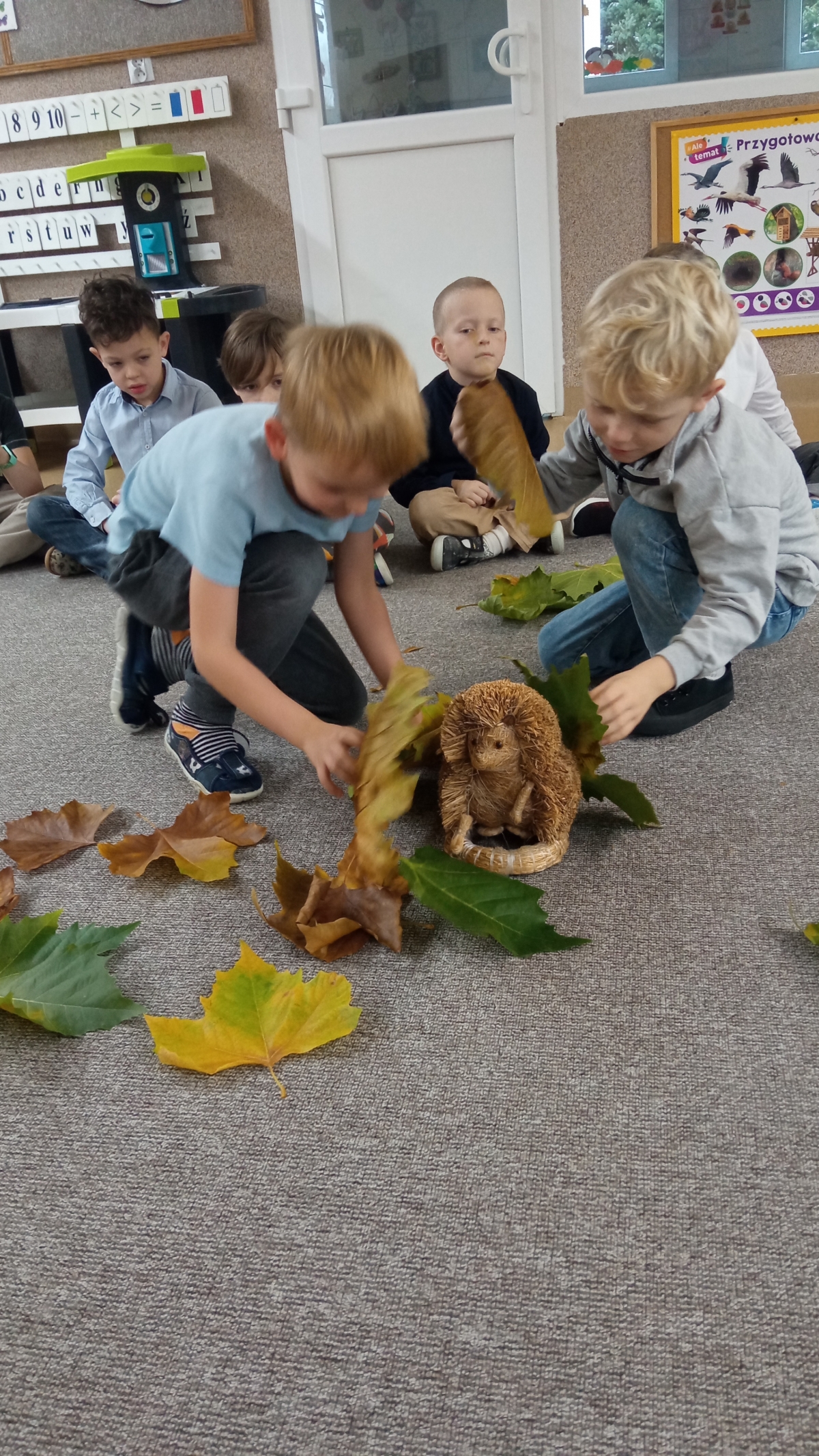 Podczas zajęć, dzieci dowiedziały się jak zwierzęta przygotowują się do zbliżającej zimy. Poznały różne sposoby radzenia sobie ptaków i ssaków np. które z nich: zasypiają na zimę, gromadzą zapasy, odlatują do ciepłych krajów, pozostają na zimę w Polsce. Na podstawie wiersza ,,Odpoczynek zimowy’’ oraz opowiadania i ilustracji Zuchy poznały środowisko jakim jest ,,Mieszkanie zwierząt-Las''. Uczyły się pisanych liter ,,l’’ i ,,L’’. Stworzyły także ciekawe prace plastyczno- techniczne z wykorzystaniem barwnych, jesiennych liści ,,Jeżyk’’. Były to inspirujące zajęcia, podczas których cała grupa była bardzo zaciekawiona i zaangażowana.