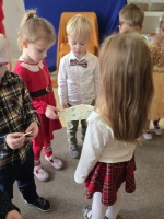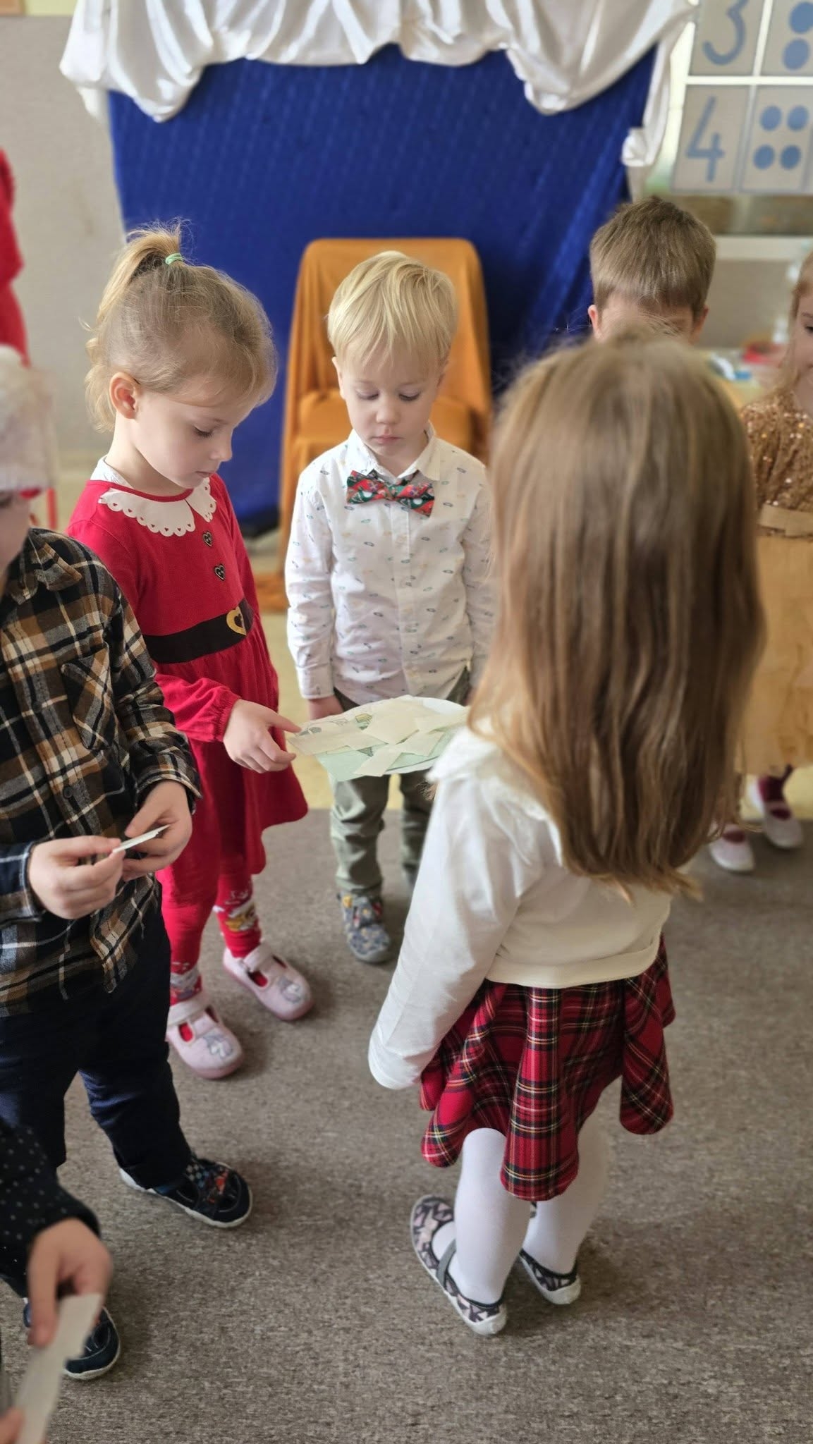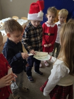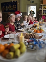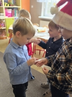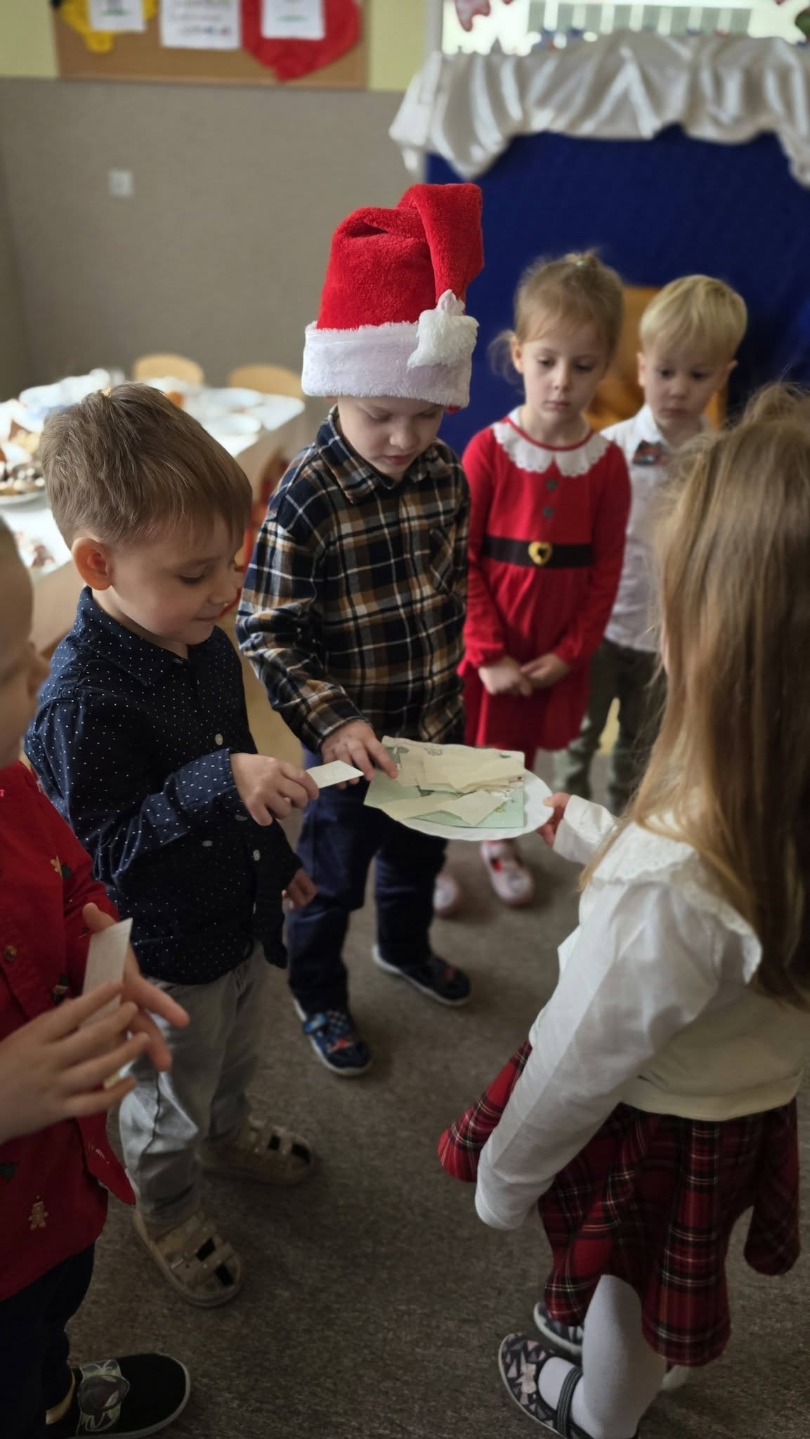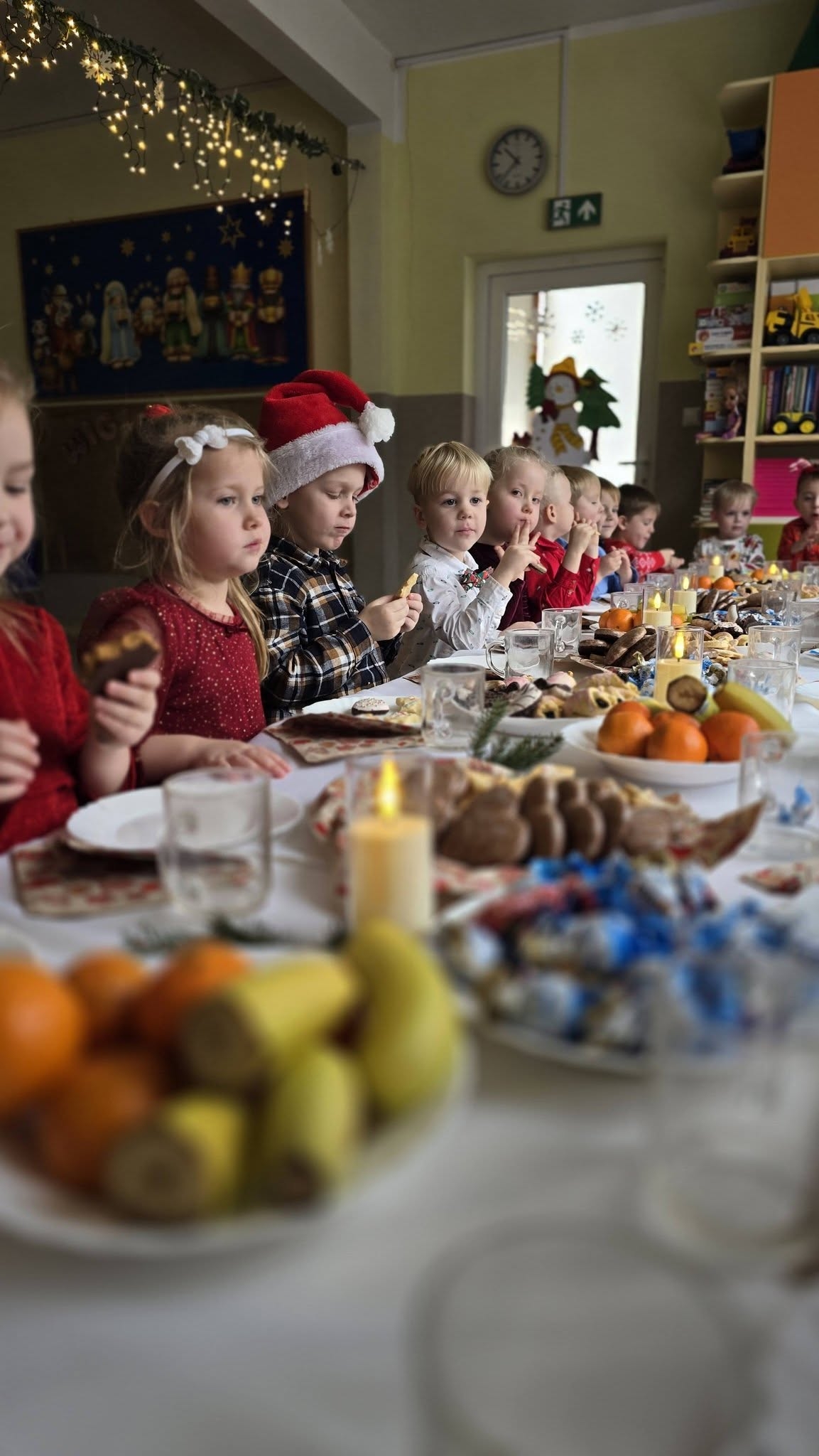 W naszym przedszkolu corocznie organizujemy uroczystą Wigilię, która jest już tradycją. Tym razem odbyła się ona 18 grudnia. Brały w niej udział wszystkie przedszkolaki oraz pracownicy przedszkola. Dzieci z najstarszej grupy przygotowały krótki program artystyczny. Pani dyrektor złożyła wszystkim obecnym świąteczne życzenia. Póżniej dzieliliśmy się opłatkiem życząc sobie nawzajem wszelkiej pomyślności i Wesołych Świąt.
