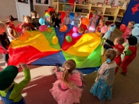Maluszki bawiły się przy wesołej muzyce, tańczyły z kolorowymi balonami oraz uczestniczyły w zabawach. Ogromną radość sprawiły dzieciom bańki mydlane, które unosiły się po całej sali ✨