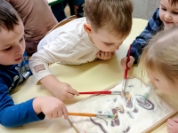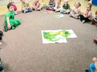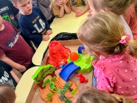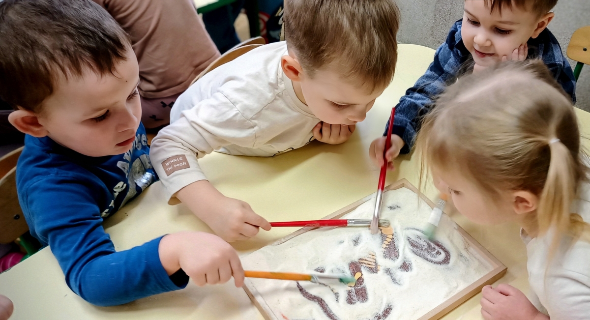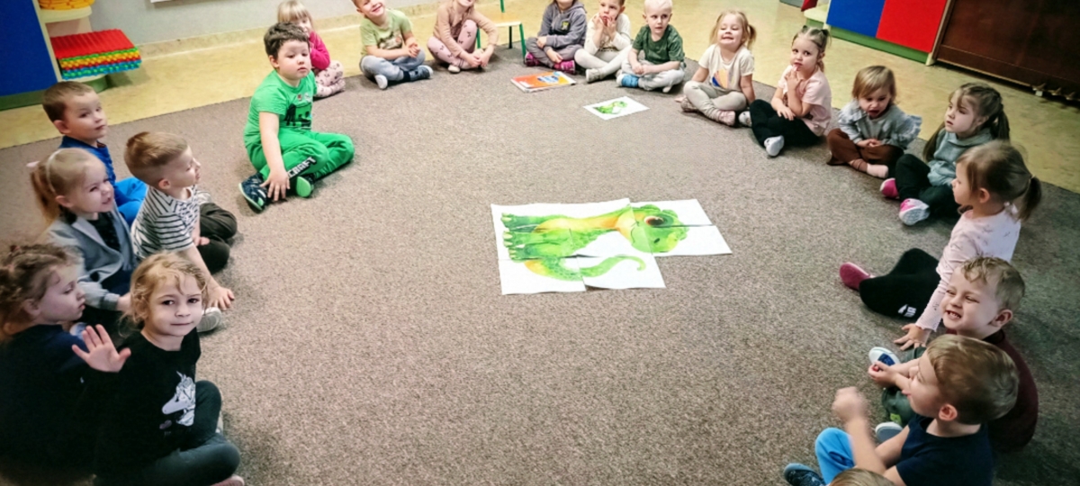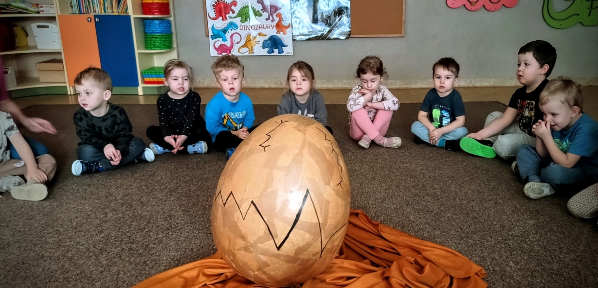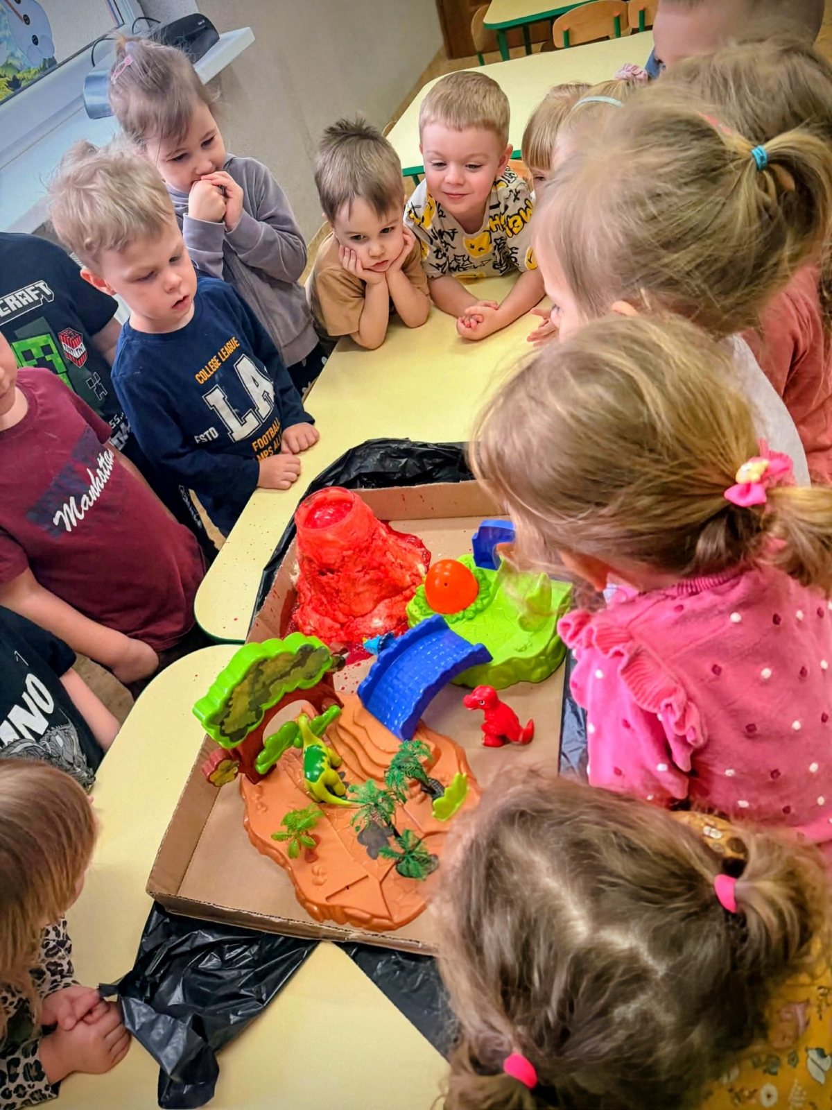 W naszej grupie Maluszki obchodziliśmy wyjątkowy Dzień Dinozaura, który dostarczył dzieciom wielu emocji i radosnych przeżyć. Już od samego rana czekała na nas niespodzianka – z wielkiego jaja wykluł się mały dinozaur, co wywołało ogromny zachwyt i uśmiechy na twarzach przedszkolaków. Następnie przenieśliśmy się do prehistorycznego świata, obserwując wybuch wulkanu podczas ciekawego eksperymentu. Dzieci miały także okazję uwolnić dinozaury zamrożone w lodowych kulach, ćwicząc cierpliwość i sprawność manualną. Ogromnym zainteresowaniem cieszyły się wykopaliska paleontologiczne – w kaszy ukryty był szkielet dinozaura, który maluszki odkrywały z wielkim skupieniem przy pomocy pędzelków, wcielając się w rolę prawdziwych badaczy. Przedszkolaki oglądały również dinozaury w technologii 3D przez specjalne okulary, co było dla nich niezwykłym doświadczeniem. Dowiedziały się także, czym różniły się dinozaury roślinożerne od mięsożernych oraz co jadły w dawnych czasach. To był dzień pełen radości, nauki i wspaniałej zabawy.