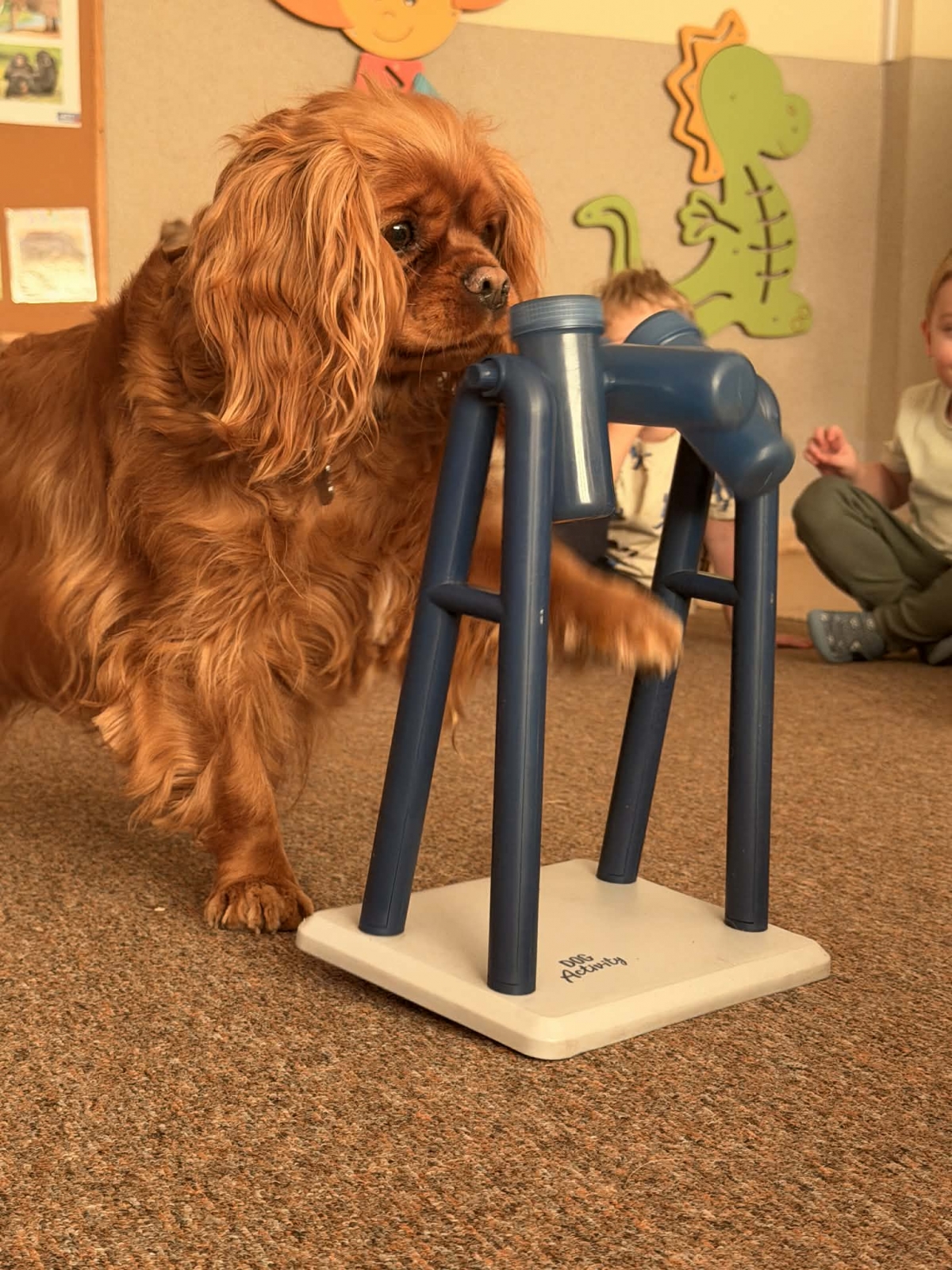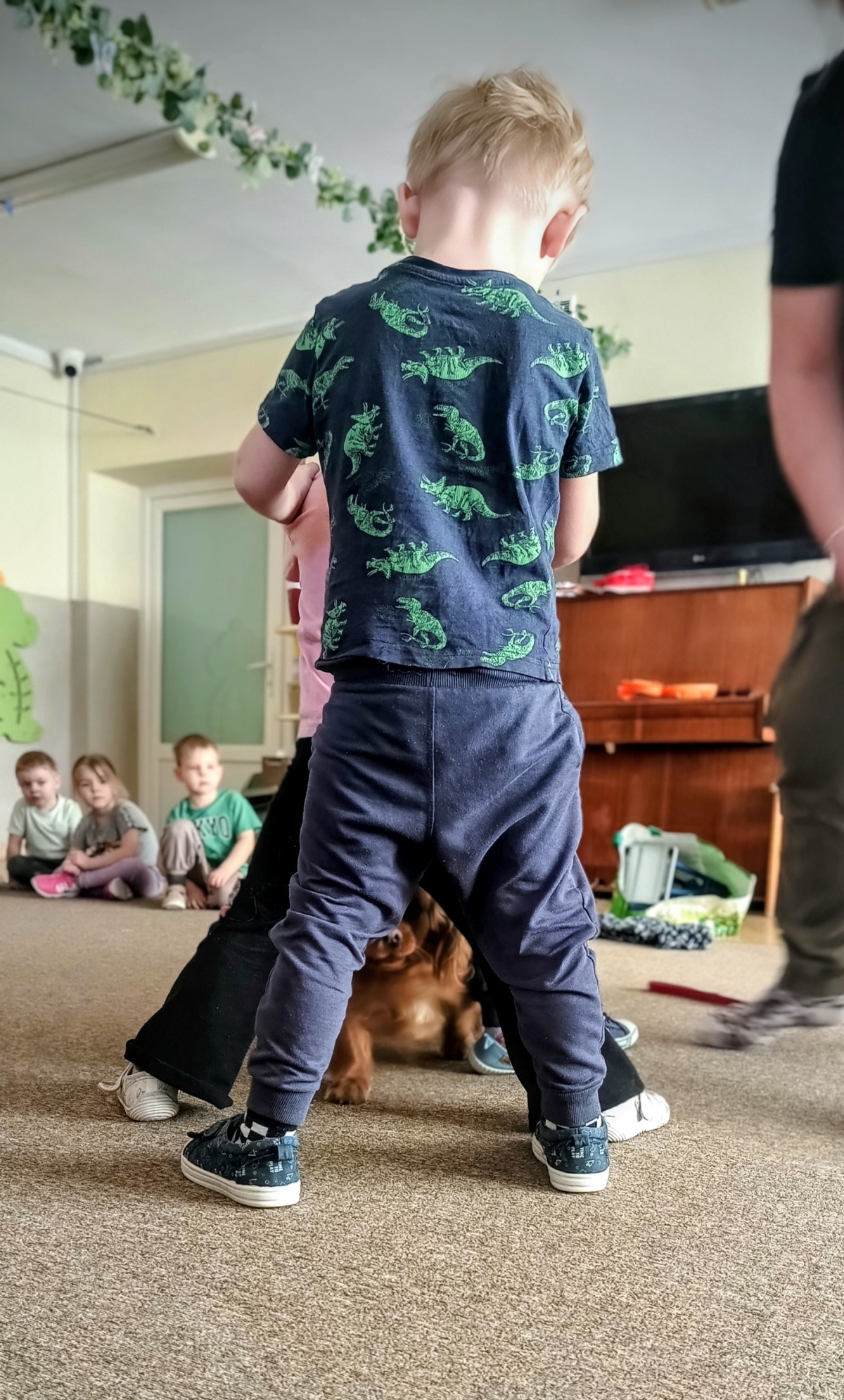 Nie zabrakło także ruchowych atrakcji. Dzieci przechodziły pod dużym, spokojnie stojącym psem, ćwicząc odwagę i zaufanie, a następnie same tworzyły tunel, przez który przebiegał mniejszy piesek. Było przy tym mnóstwo śmiechu i pozytywnych emocji.