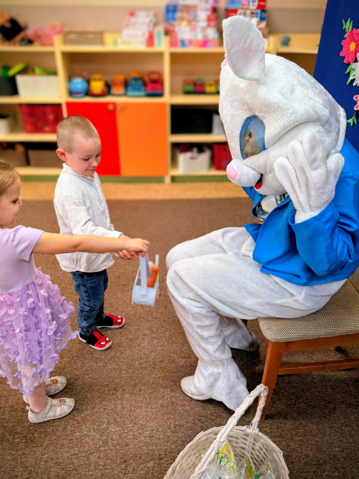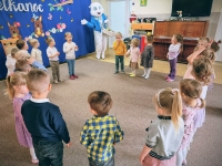 W pewnym momencie wydarzyło się coś wyjątkowego – do sali przyszedł zajączek wielkanocny. Dzieci powitały go z ogromną radością i wręczyły mu przygotowaną wcześniej marchewkę. Spotkanie sprawiło maluchom wiele emocji i uśmiechu.