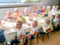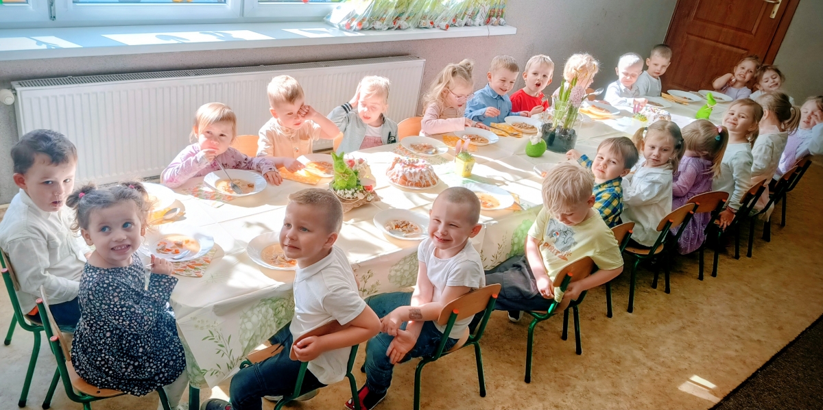 Po powrocie do przedszkola dzieci usiadły do wspólnego posiłku. Z apetytem zjadły tradycyjny żurek oraz wcześniej udekorowaną babkę. Był to dzień pełen wrażeń, wspólnej zabawy i świątecznej radości, który na długo pozostanie w pamięci maluszków.